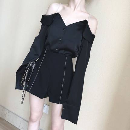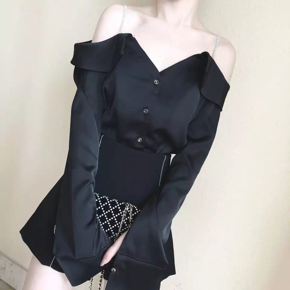 小众女露肩吊带性感衬衫一字肩纯夏季黑色设计感衬衣白色新款上衣