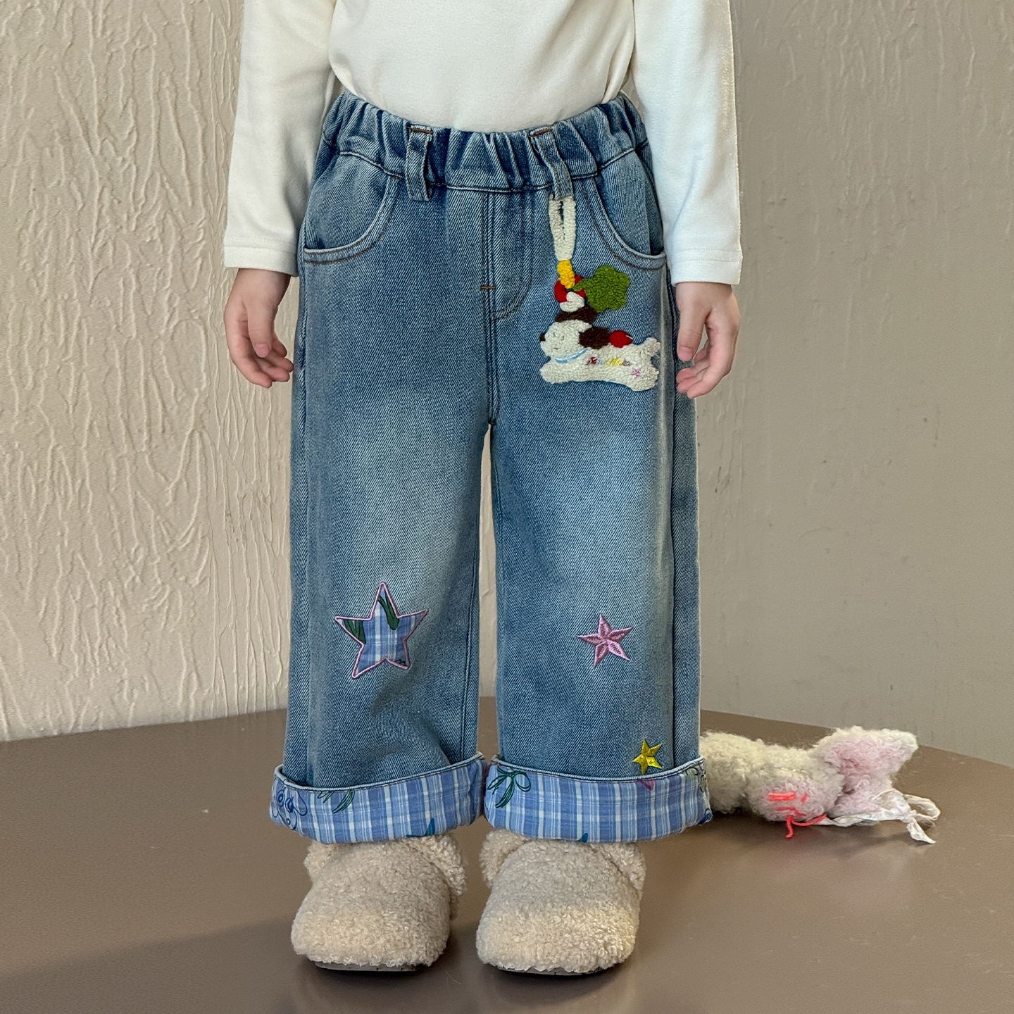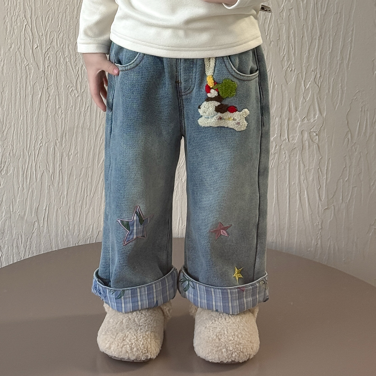 女童加绒牛仔裤2025秋冬新款直筒裤女宝宝一体绒深秋冬季加厚裤子
