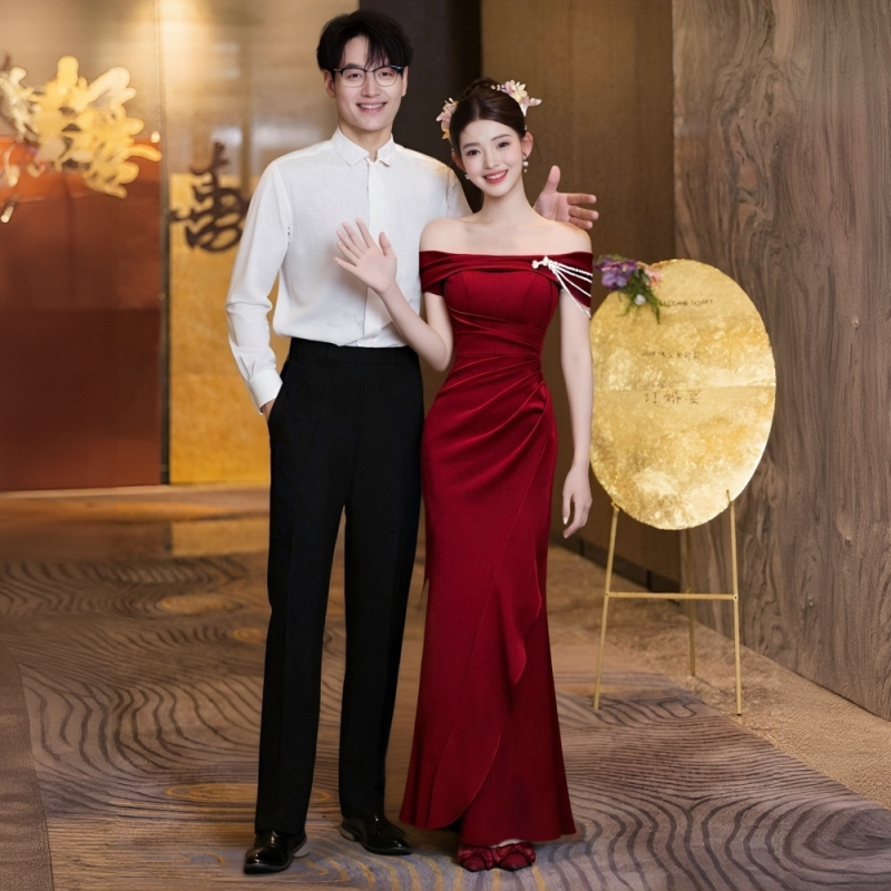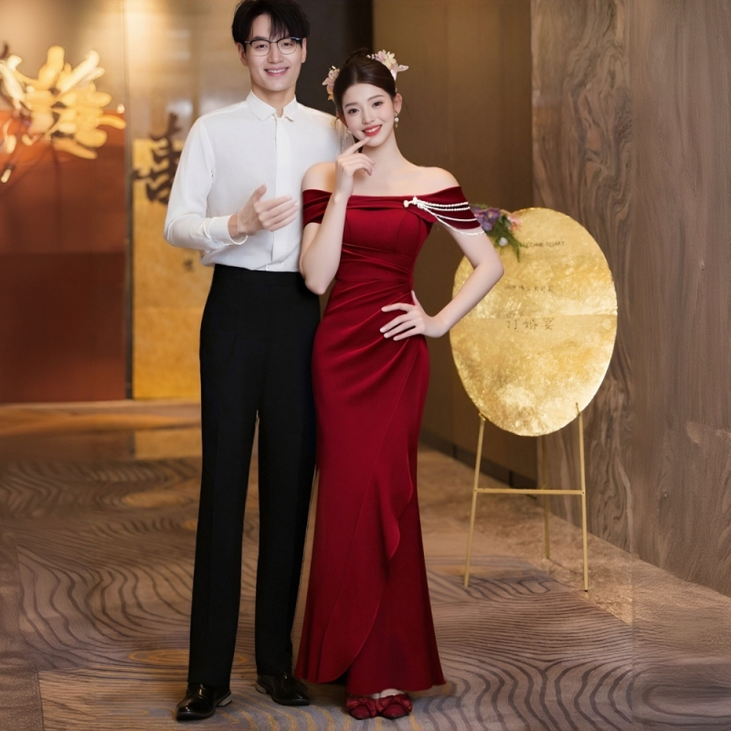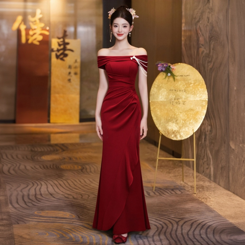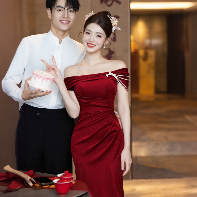 法式高端一字肩敬酒服新娘酒红色鱼尾订婚连衣裙高级感结婚晚礼服