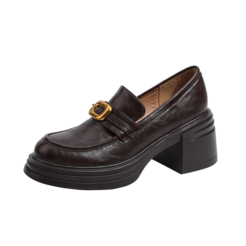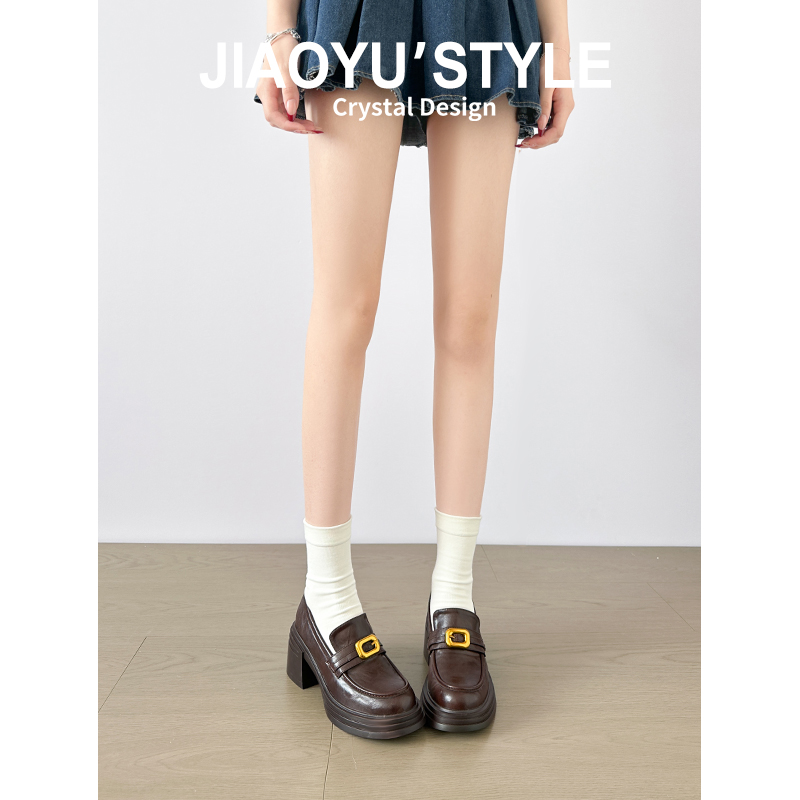 真皮~骄屿复古金属扣一脚蹬小皮鞋圆头百搭厚底通勤英伦乐福单鞋
