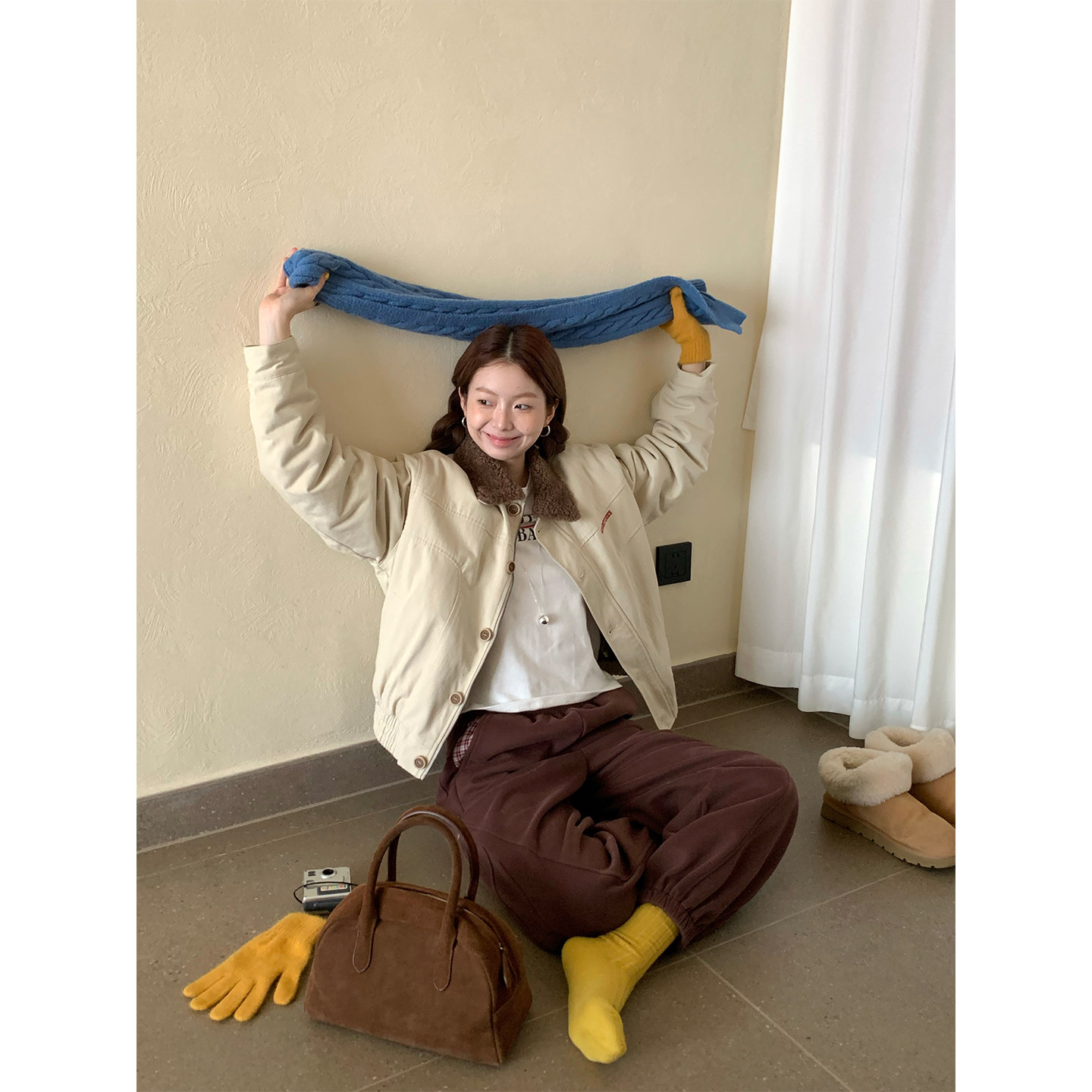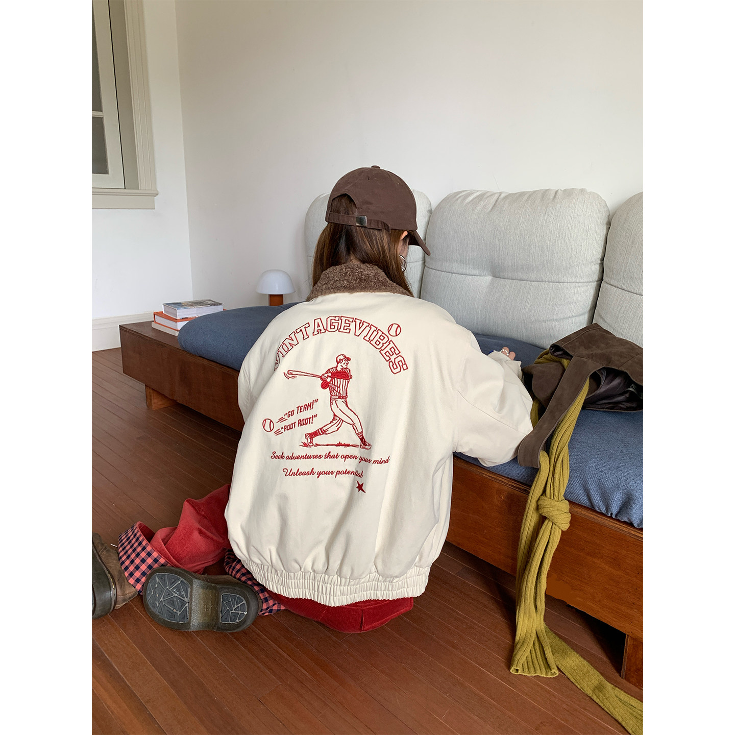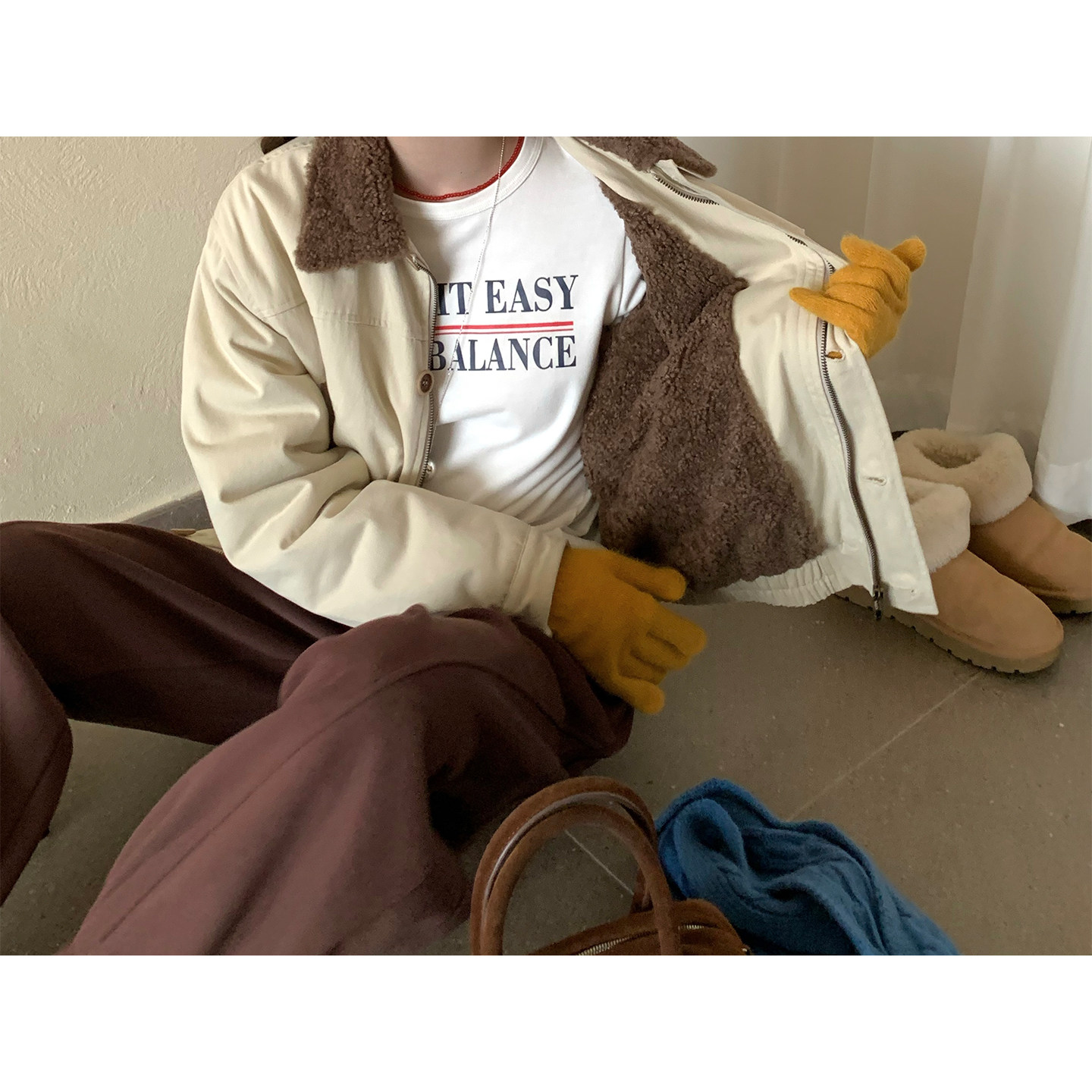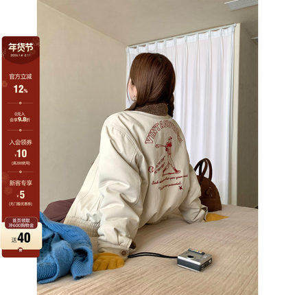 CCKOK 冬季韩系通勤气质保暖美式复古刺绣米杏色翻领内羔毛外套女