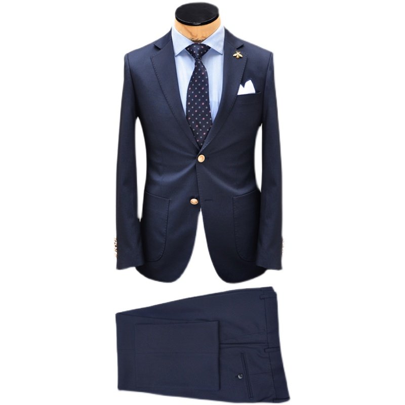 ZBTO男装重磅经典海军蓝布雷泽单排扣修身羊毛制服款男士西服套装
