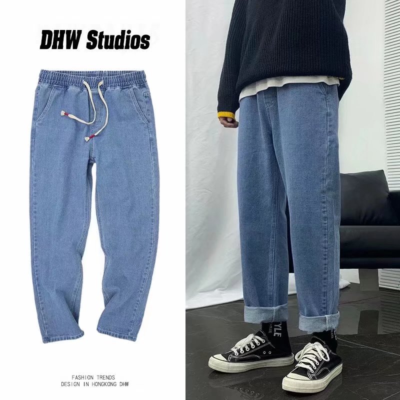 2024四季可穿休闲直筒牛仔裤男生潮牌宽松弹力腰系绳春夏松紧腰长