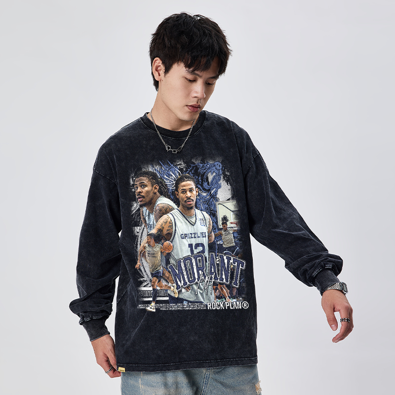摇滚计划灰熊莫兰特印花长袖秋季全棉美式运动正肩T恤美式学生男