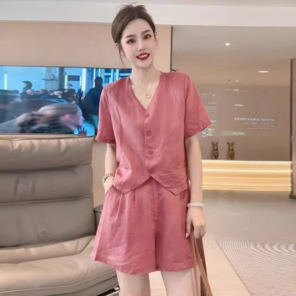 夏装短袖V领休闲上衣阔腿短裤子两件套纯色高级感时尚运动套装潮