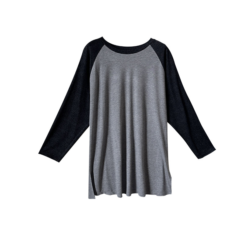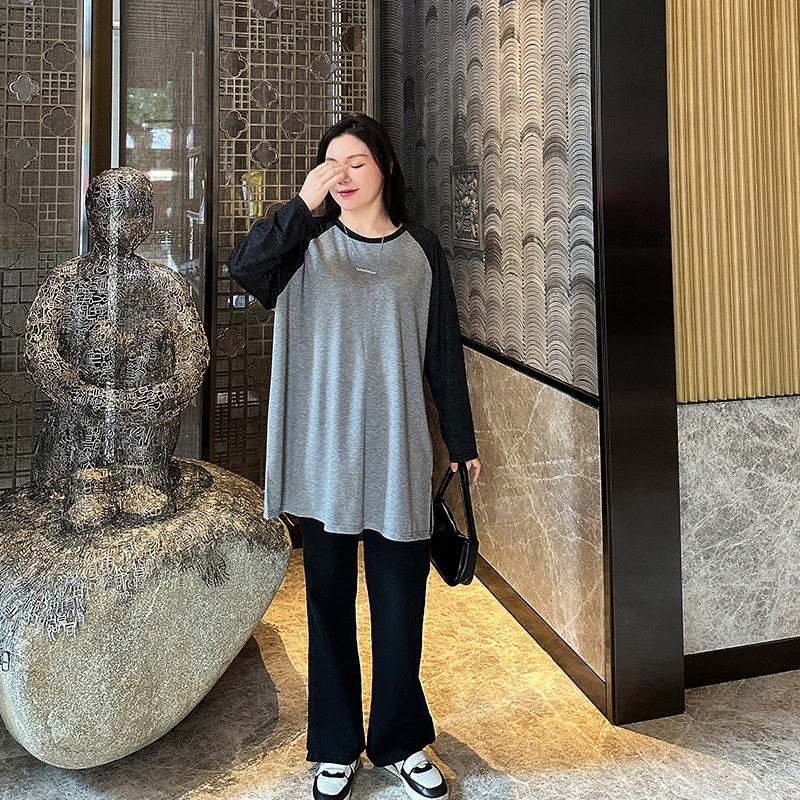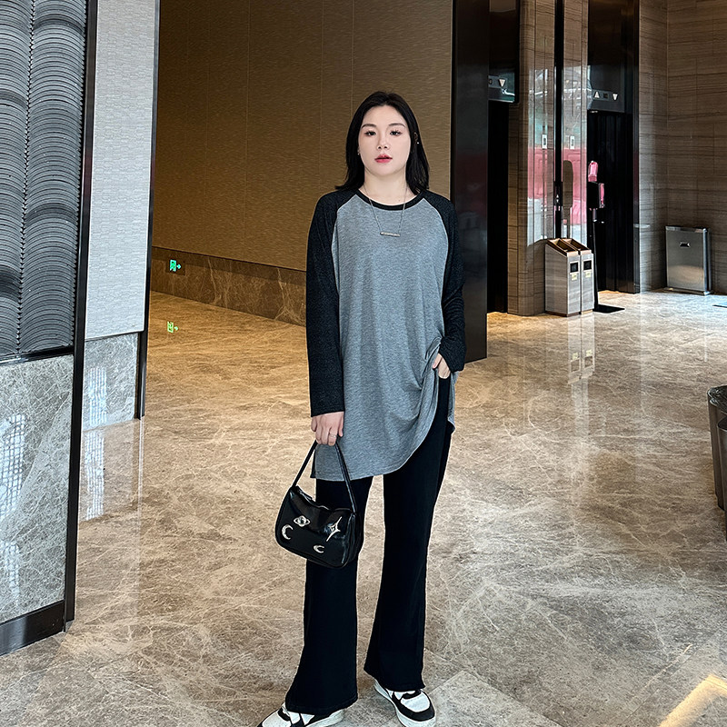长款针织衫特大码女装200斤加肥加大上衣胖妹妹mm撞色圆领长袖T恤
