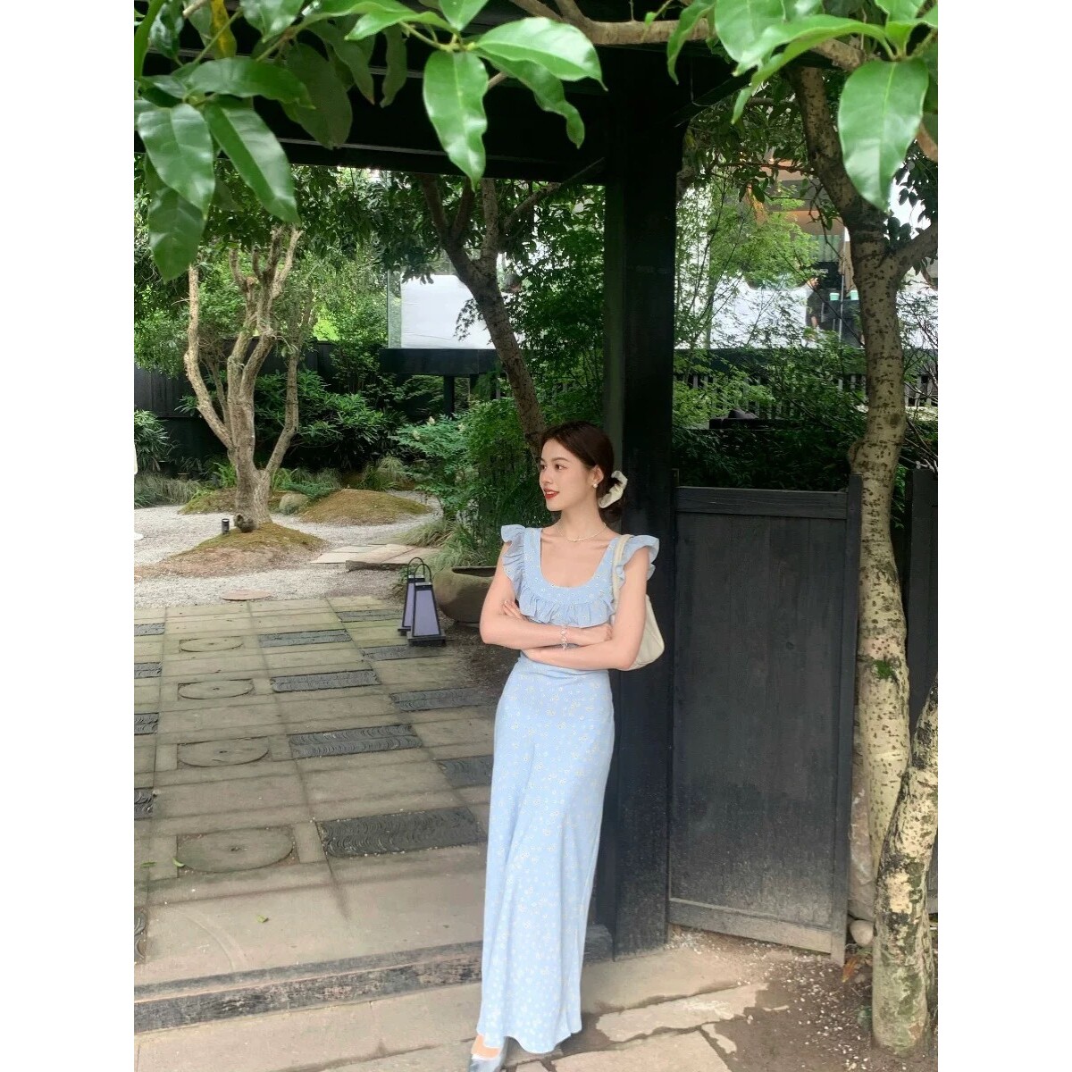 法式少女碎花中长款荷叶边裙女性感修身夏季度假花边吊带连衣裙子