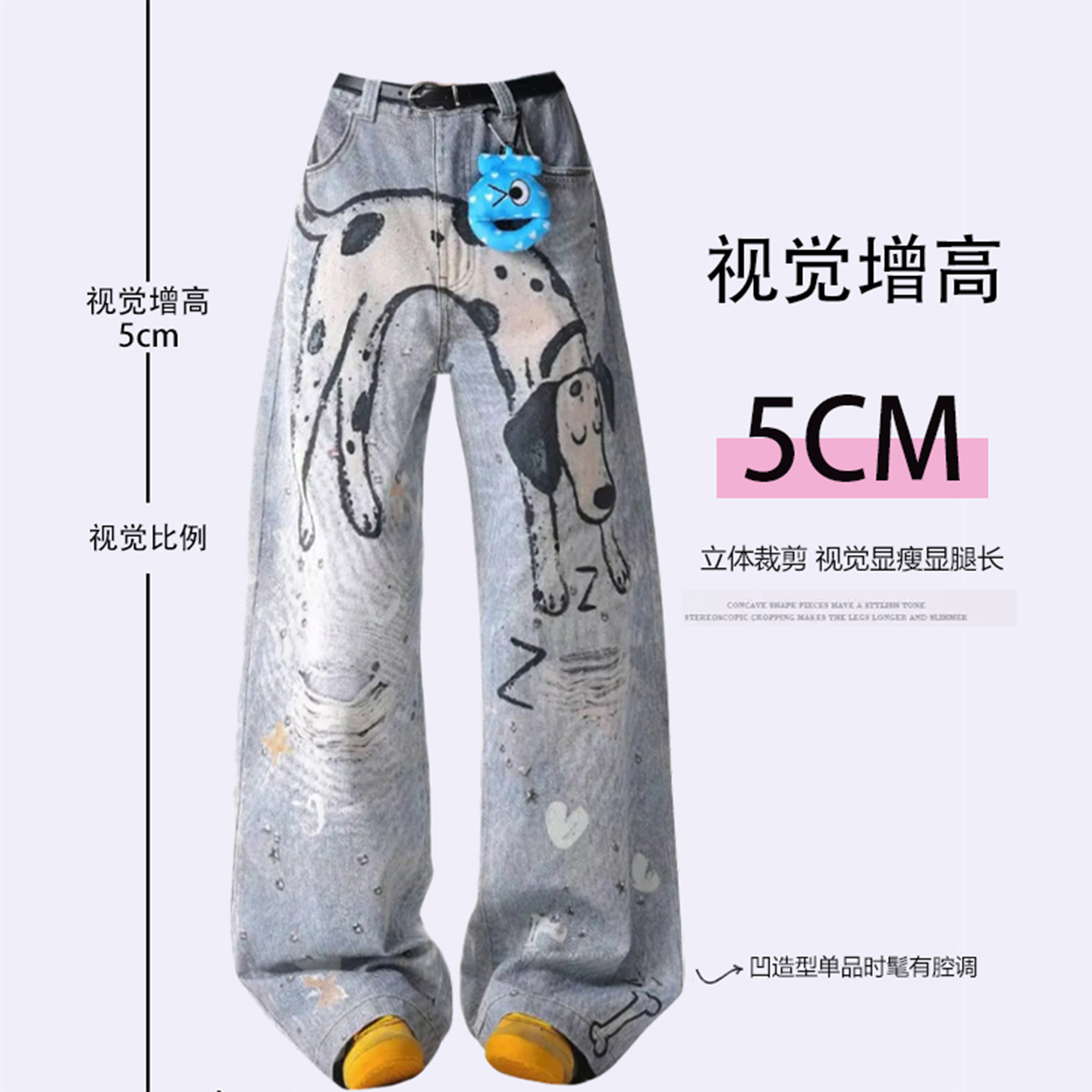 特大码胖mm小狗印花高腰设计感牛仔裤女秋季宽松百搭显瘦阔腿裤子