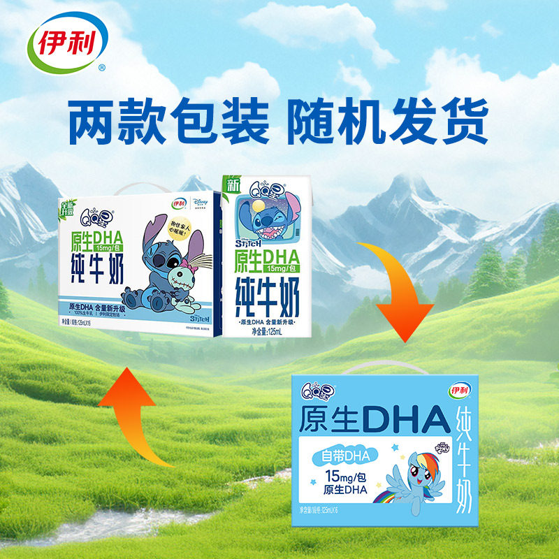 伊利QQ星原生DHA纯牛奶儿童奶早餐奶125ml*16成长高钙生牛乳盒装