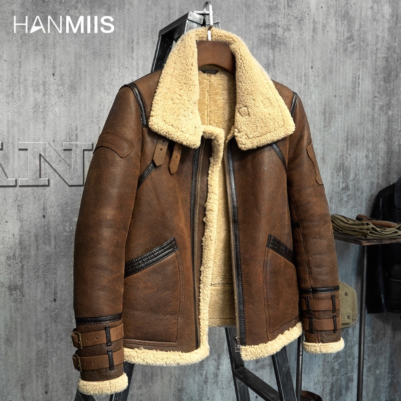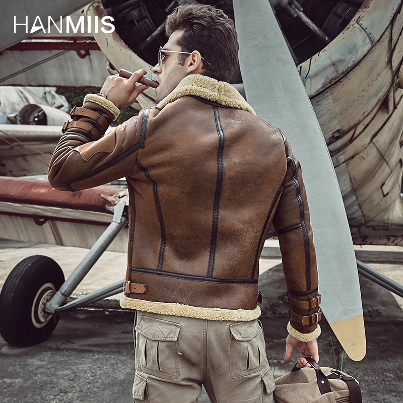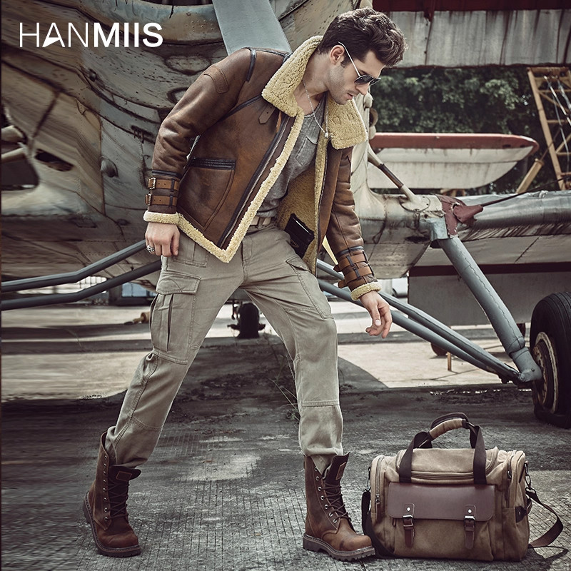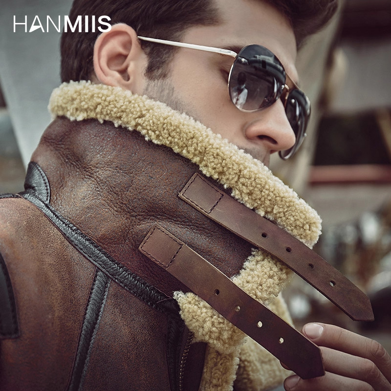 HANMIIS徽章新款飞行服空军皮毛一体皮草男外套真皮夹克绵羊皮衣