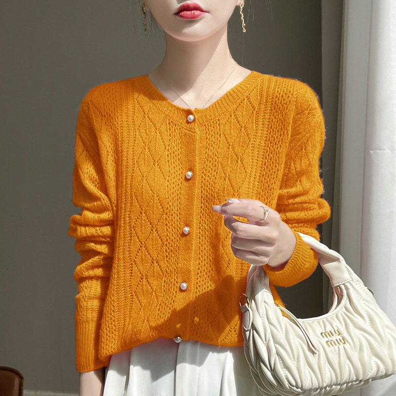 柔软舒适羊绒镂空长袖开衫女宽松纯色百搭提花100羊毛衫针织外套