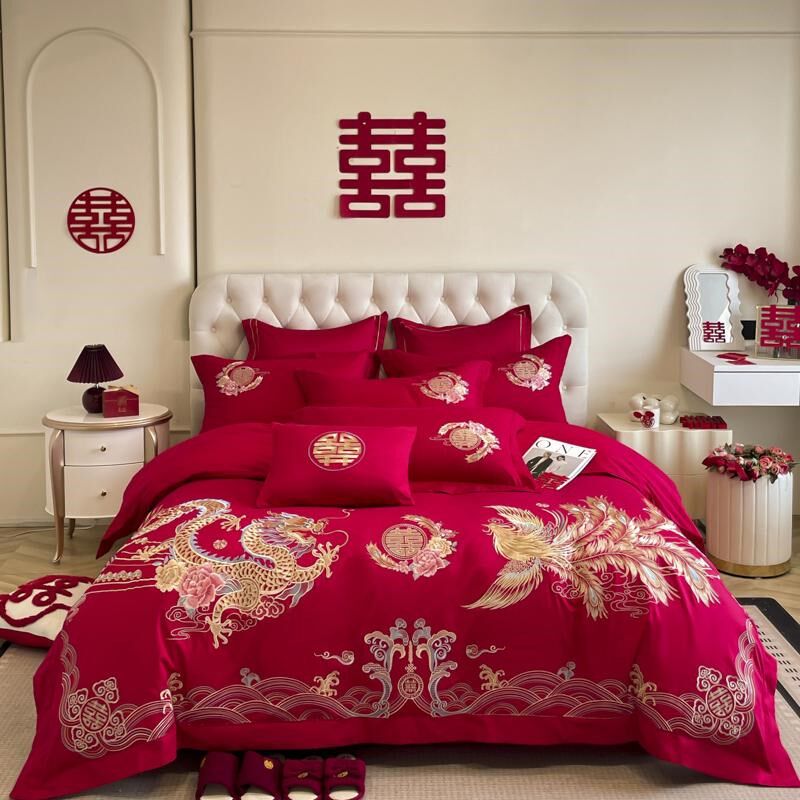 高端婚庆四d件套大红色龙凤刺绣被套床单全棉纯棉结婚床上用品婚