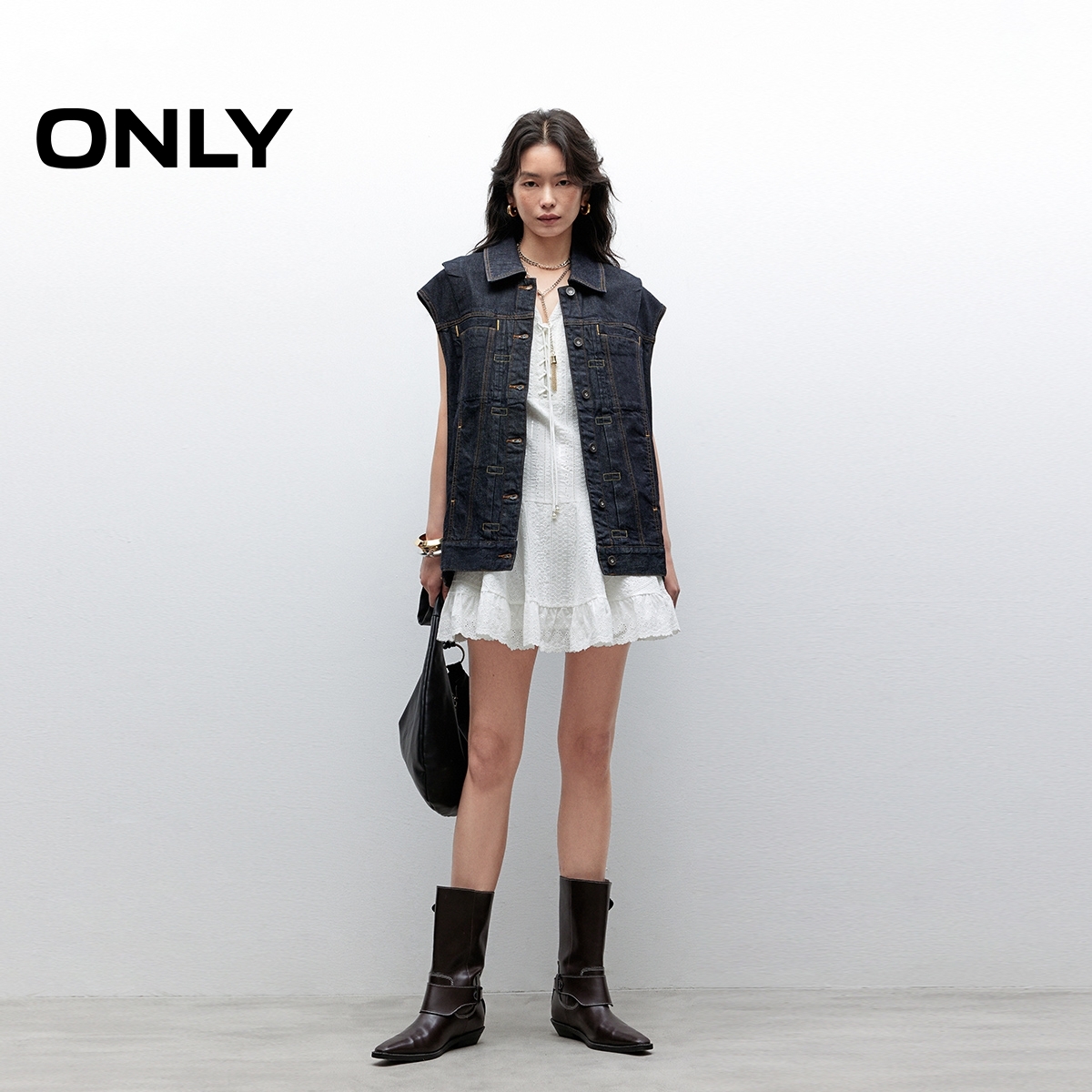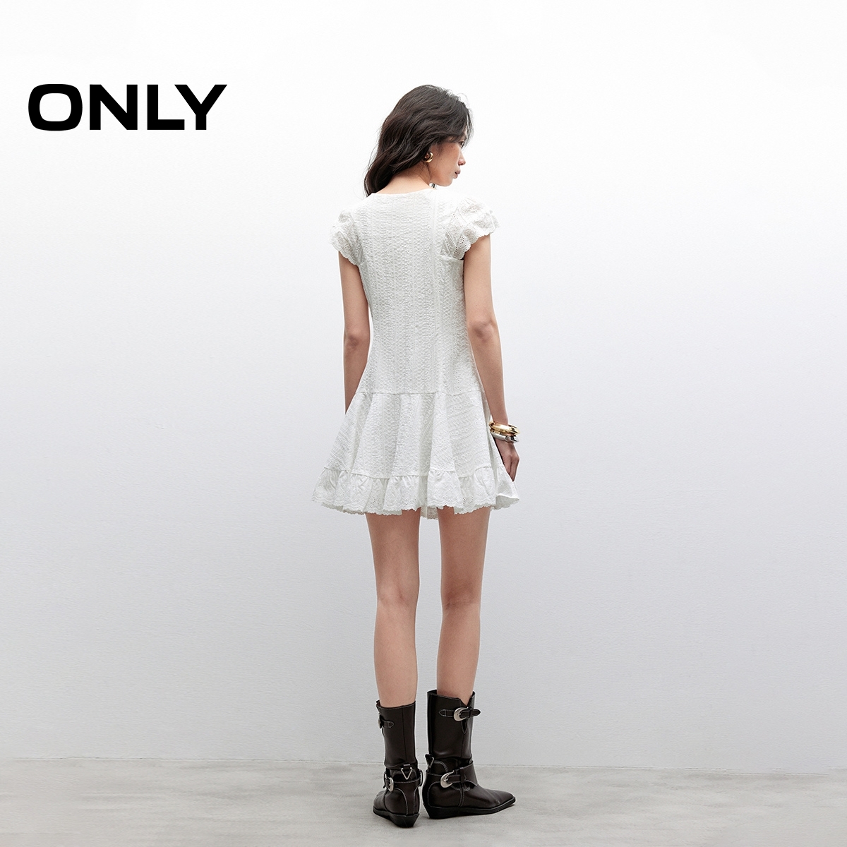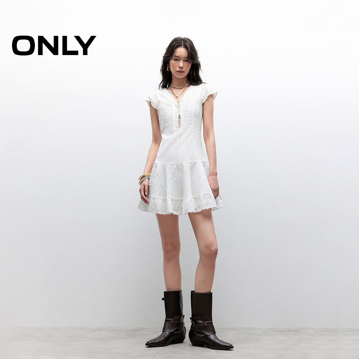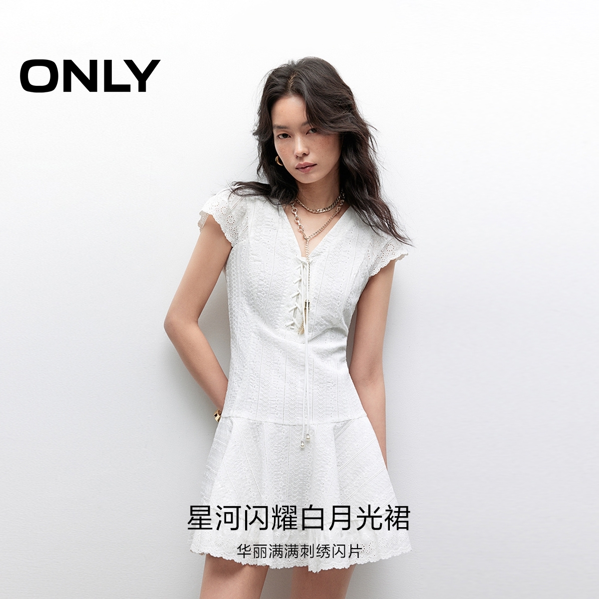 ONLY2025秋季新款甜美风重工刺绣闪片装饰V领小飞袖短裙连衣裙女