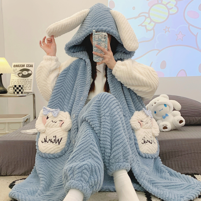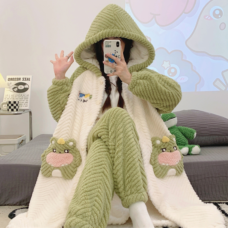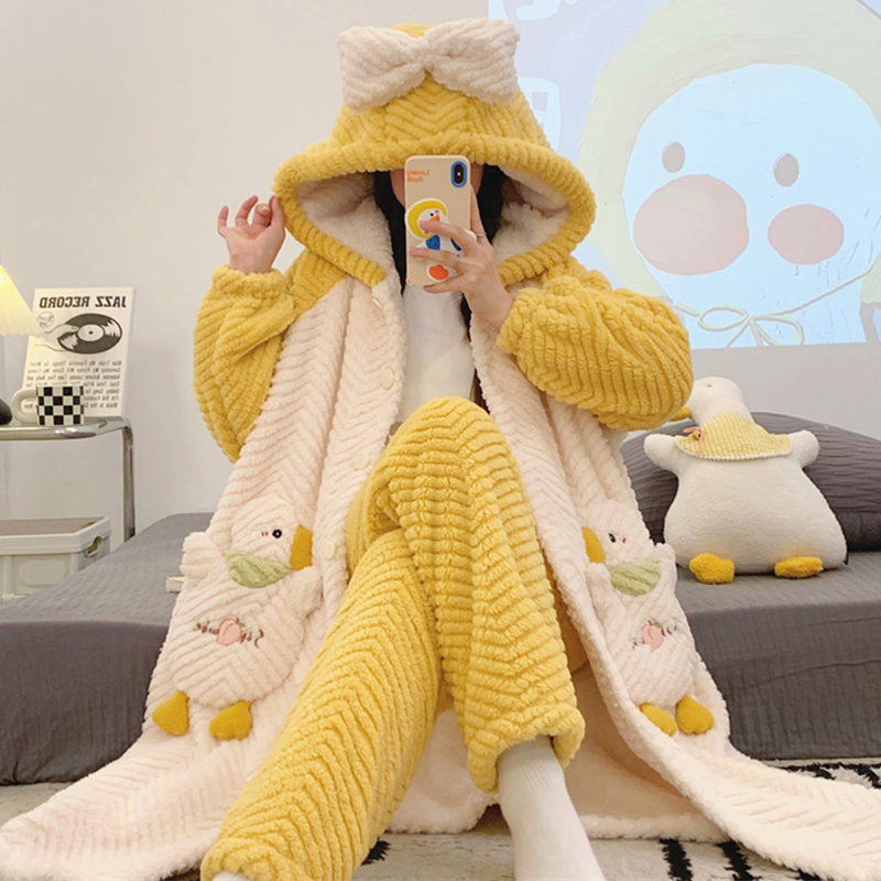 秋冬季珊瑚绒月子服三件套加厚加绒产后哺乳孕妇睡衣春秋睡袍连帽