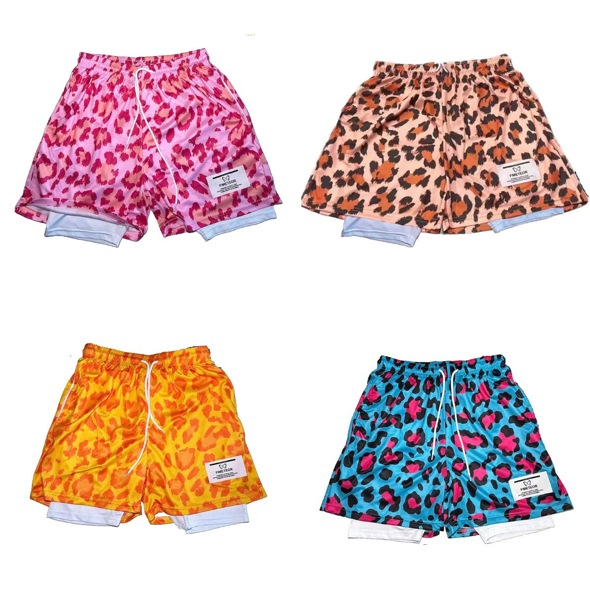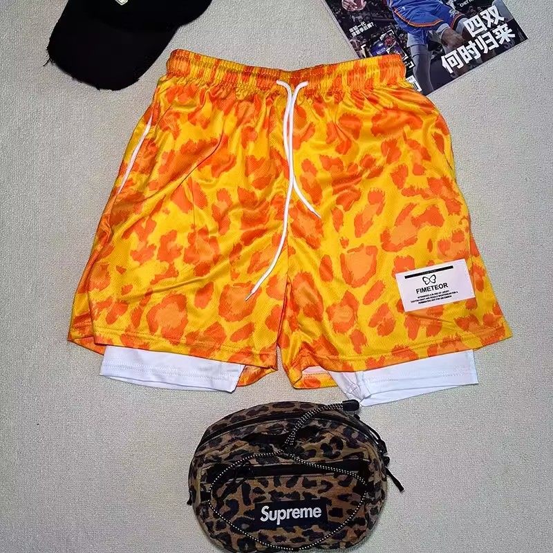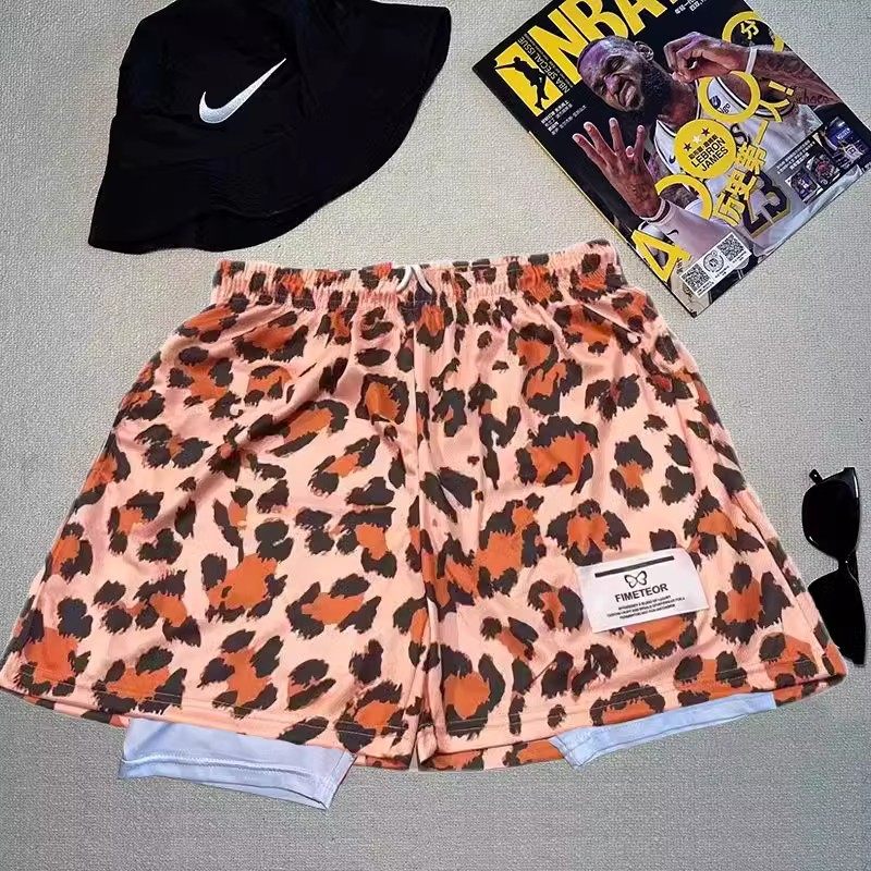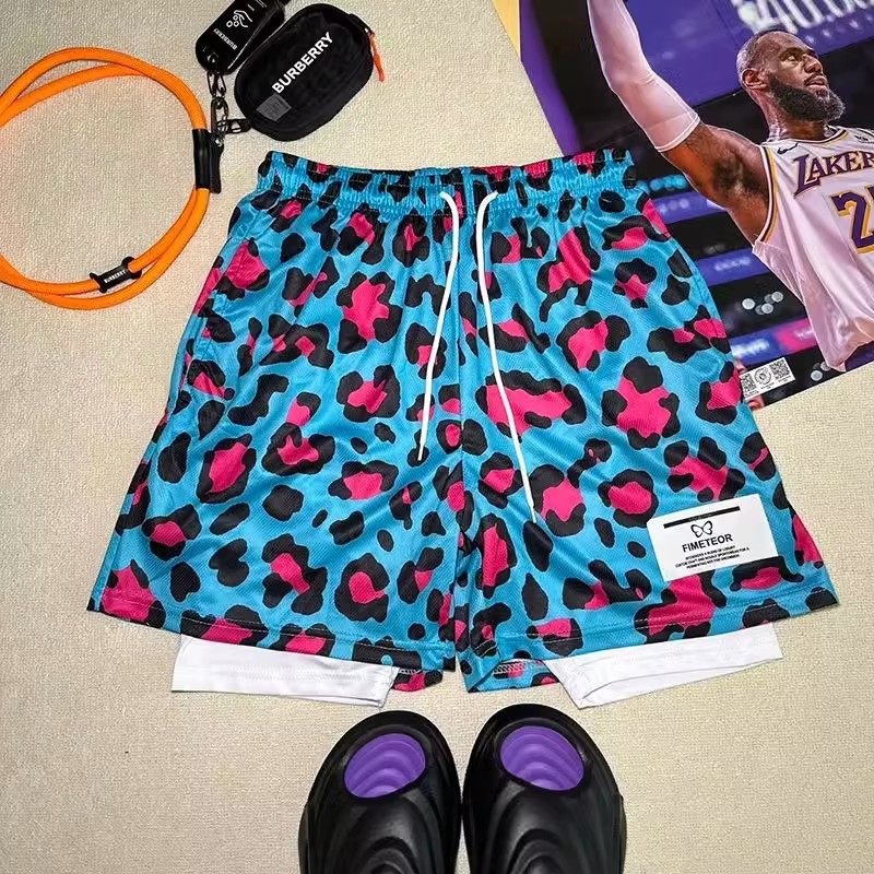 学生夏季透气运动短裤男美式宽松直筒休闲粉色豹纹篮球三四分裤子