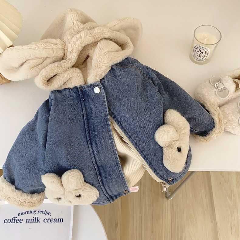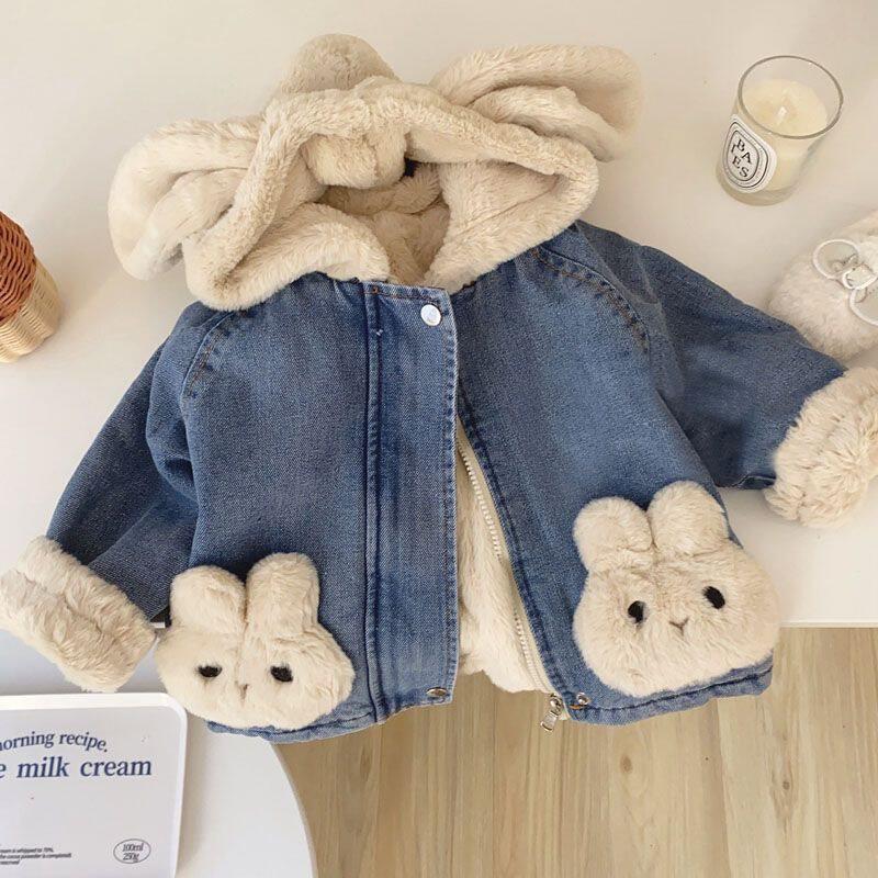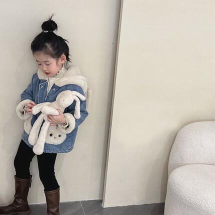 女童秋冬装加绒牛仔外套儿童冬季加厚连帽牛仔2025新款女宝宝