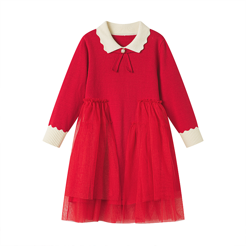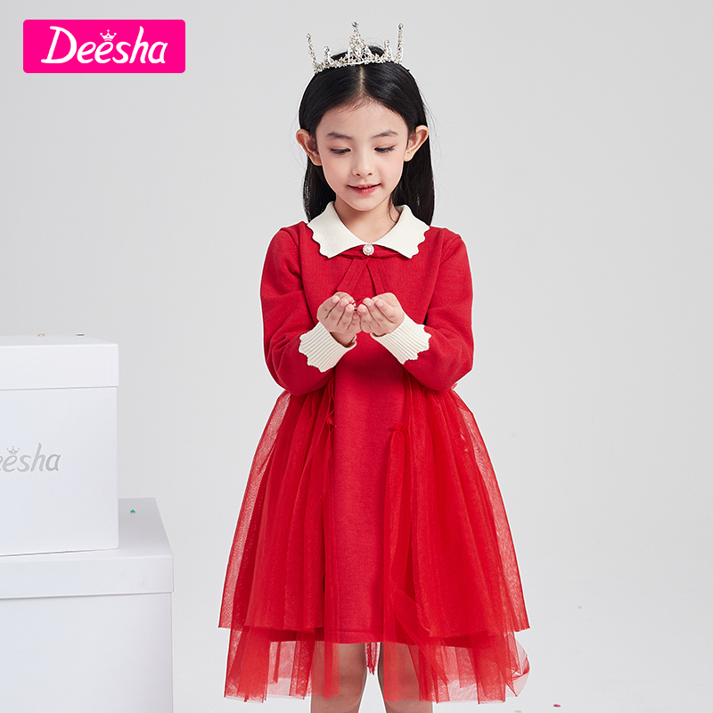 笛莎女童连衣裙秋冬季新款大童新年装儿童拜年服红色公主网纱裙子