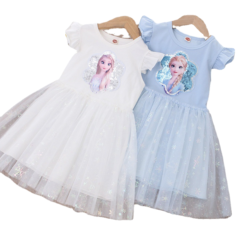 2025女童夏季新款飞飞袖连衣裙公主宝宝日常卡通亮片爱莎网纱裙子