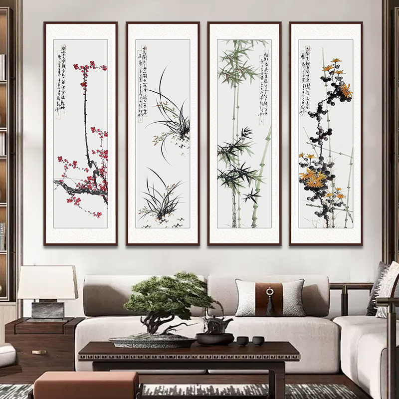 梅兰竹菊四条屏手绘真迹国画花鸟挂画新中式客厅沙发背景墙装饰画