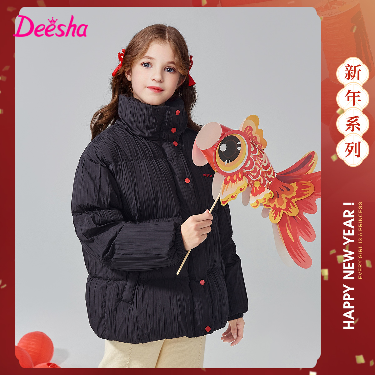 笛莎童装儿童女童羽绒服冬季新款女大童加厚新年装红色立领面包服