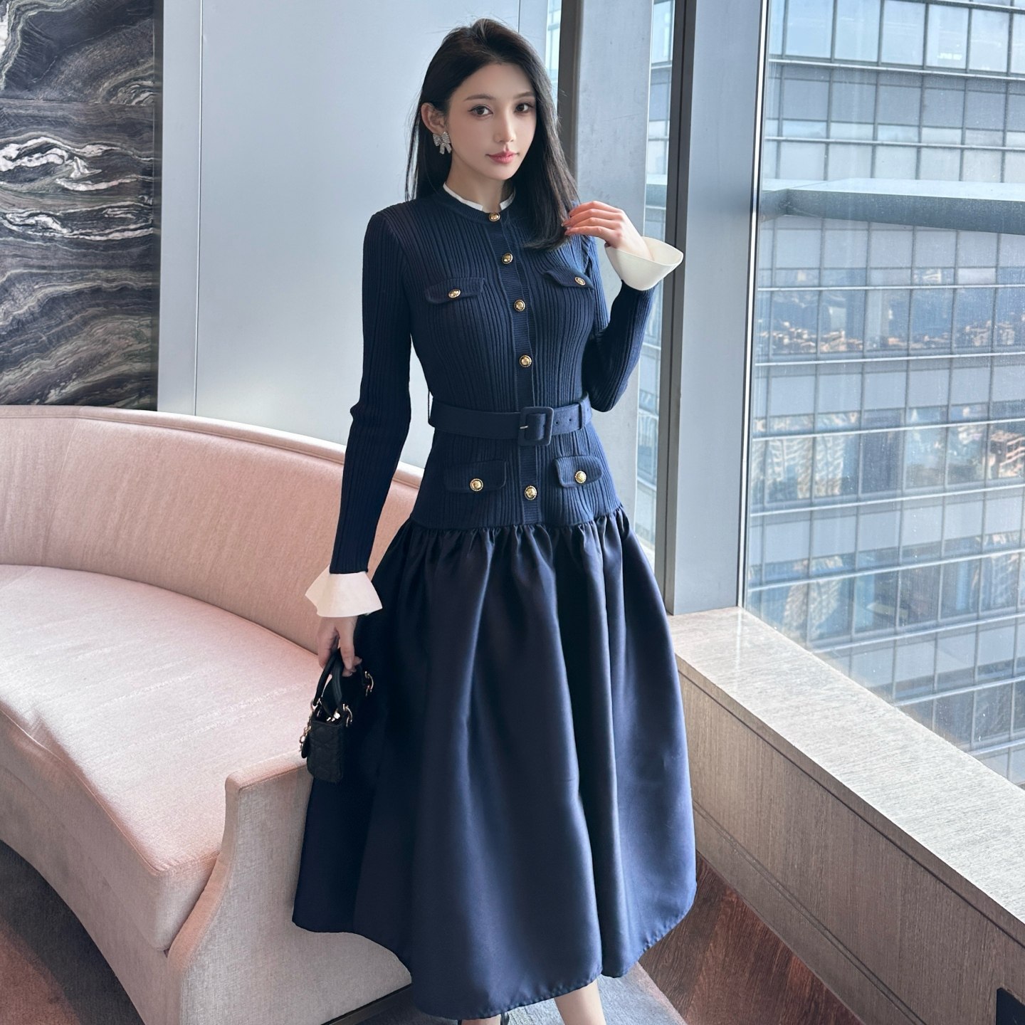 2025秋冬新款藏蓝色千金风针织拼接塔夫绸修身收腰长袖连衣裙礼服