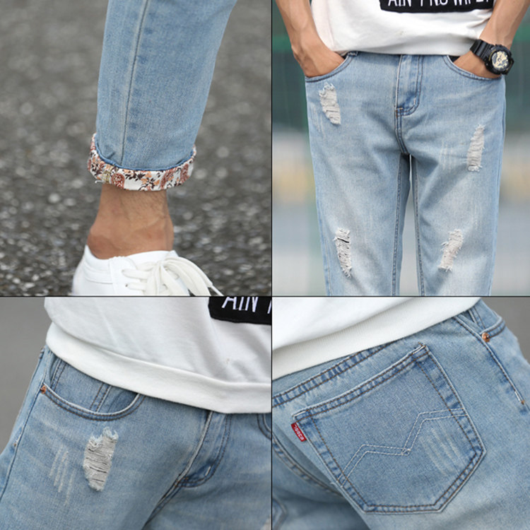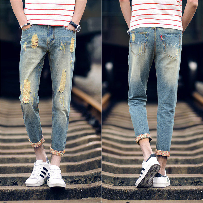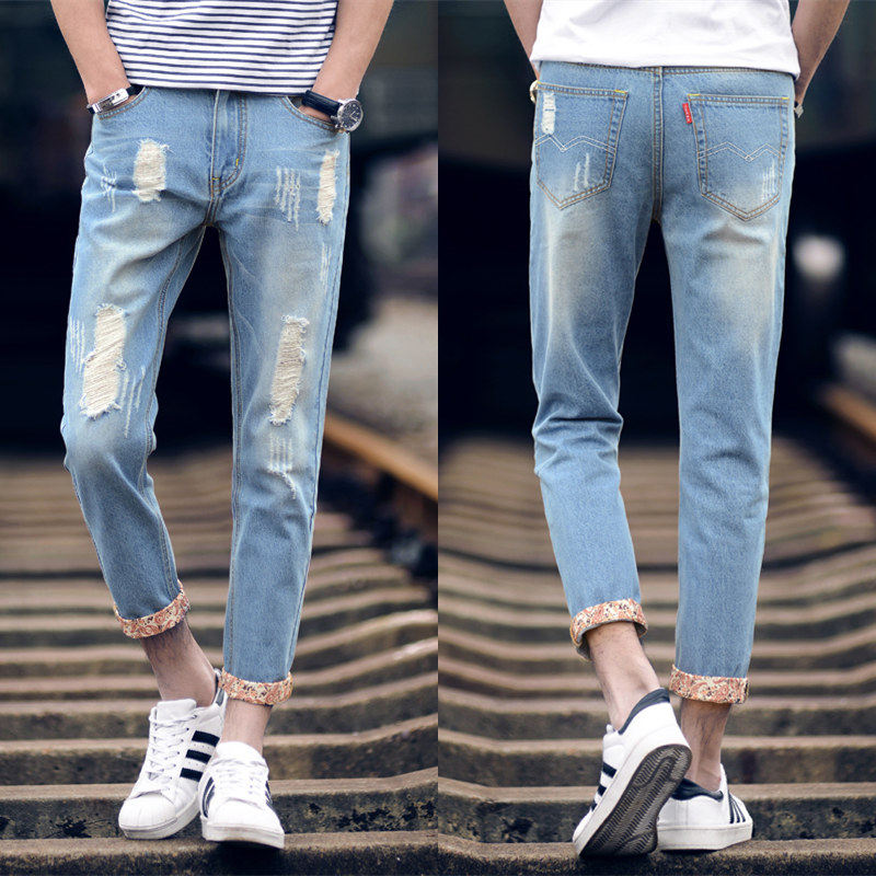 九分牛仔裤男夏季薄款破洞直筒宽松休闲裤结实小脚长裤子男士潮牌