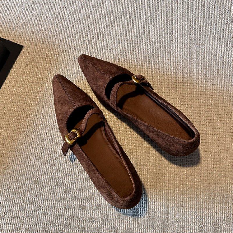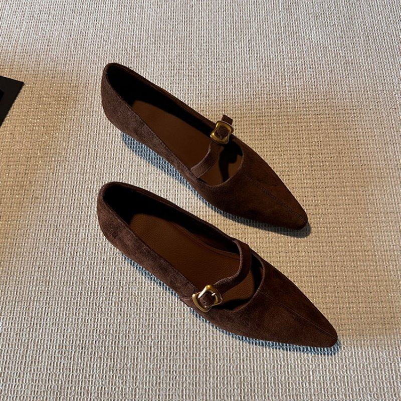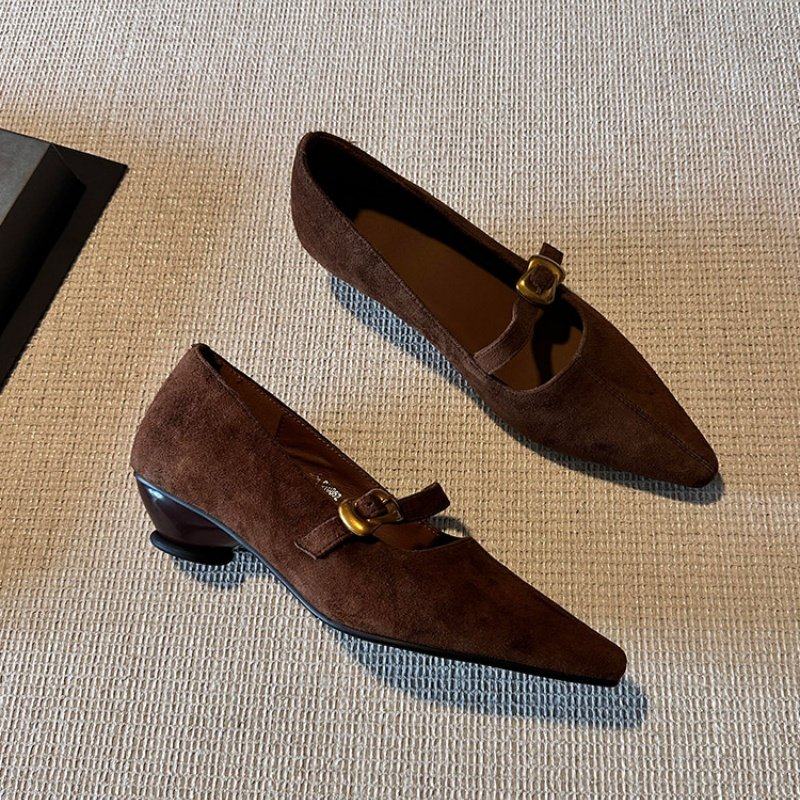 软皮复古棕色简约粗跟单鞋女2026一字带磨砂皮尖头浅口软底工作鞋