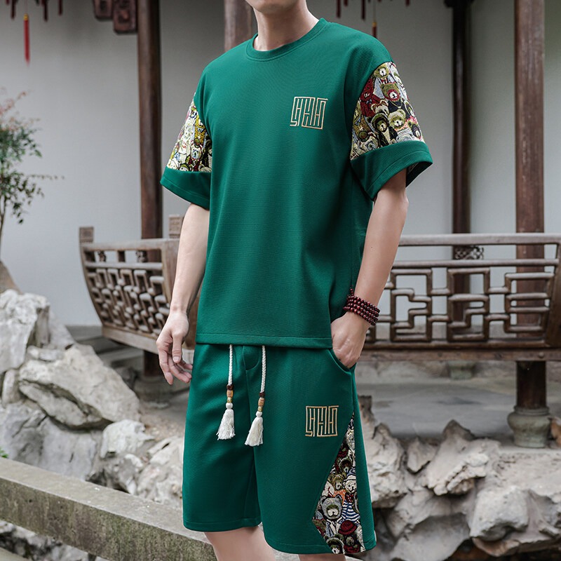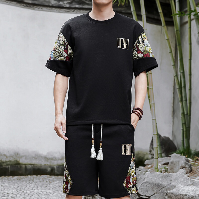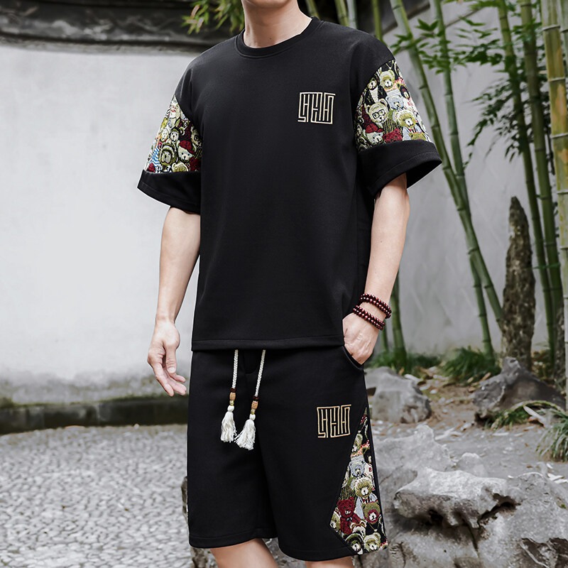 刺绣中国风T恤套装男薄款短裤休闲运动套装夏季