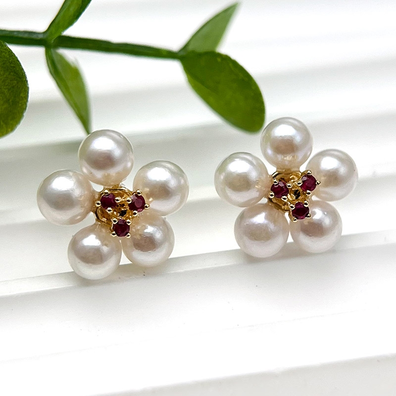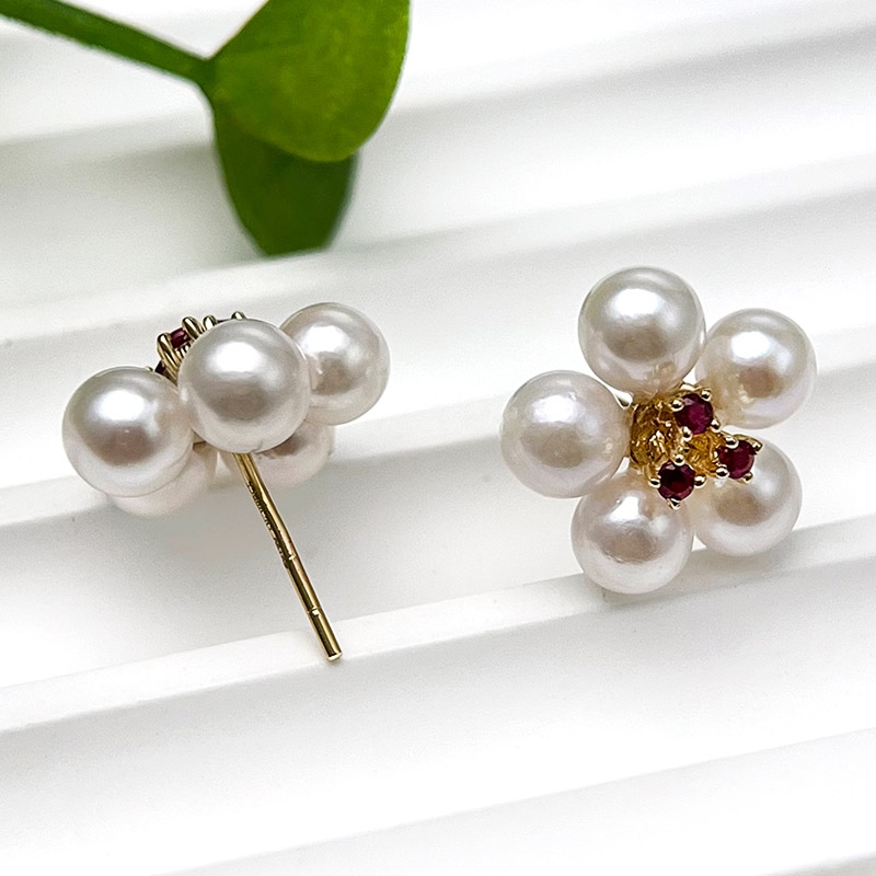 【珍珠皇后】18K金日本海水akoya珍珠+红宝石多珠梅花耳钉4-5mm