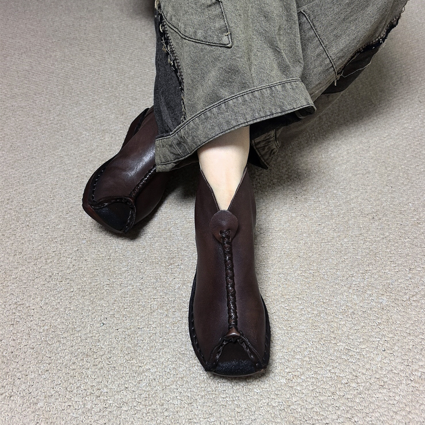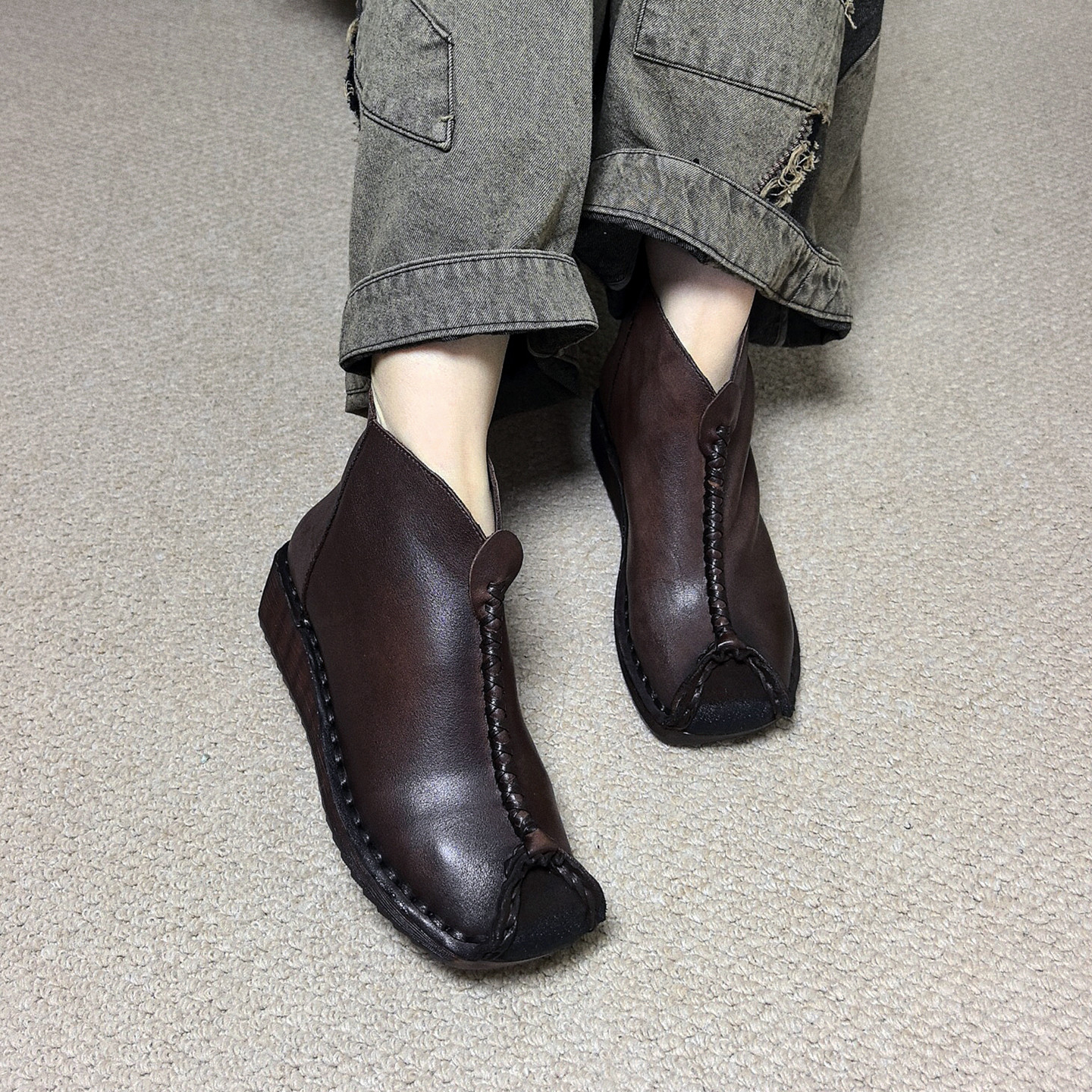 民族风真皮牛筋软底坡跟妈妈短靴