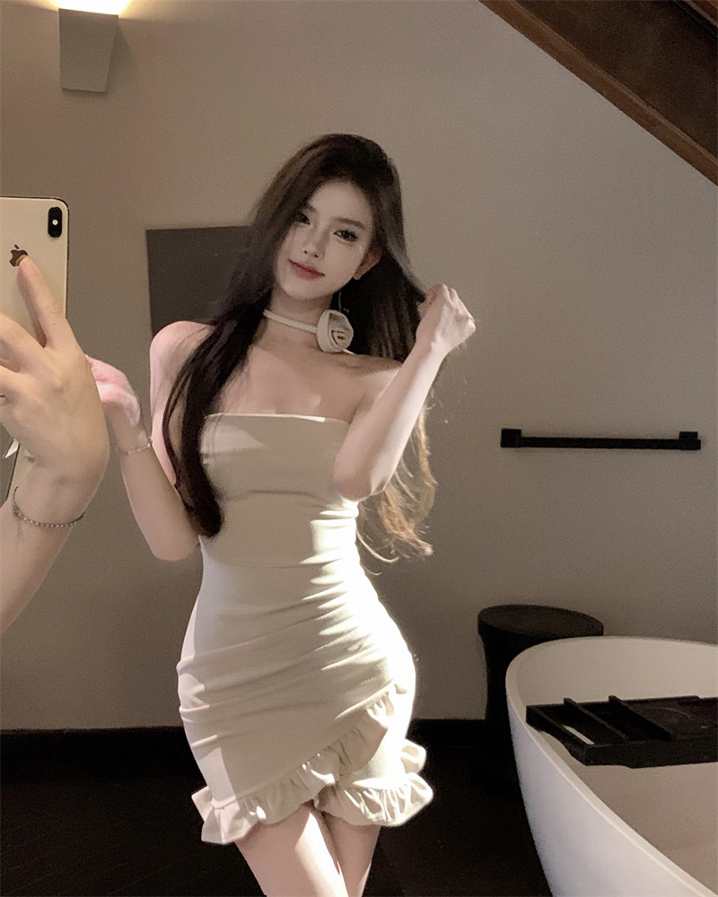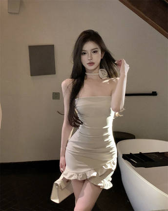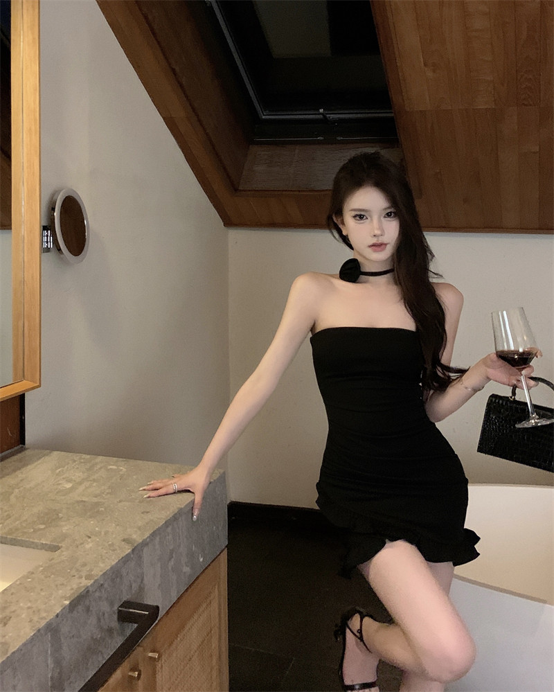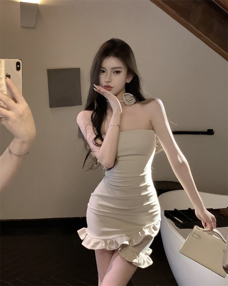 150矮个子纯欲性感一字肩抹胸收腰荷叶边包臀连衣裙短裙加小码xxs