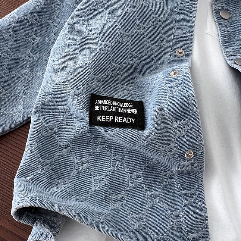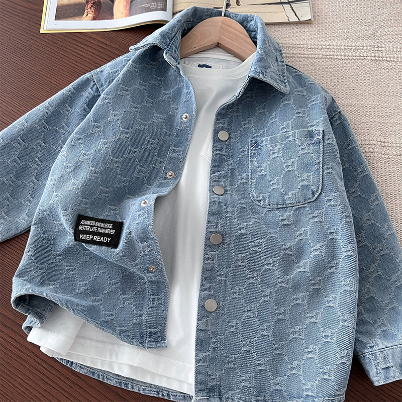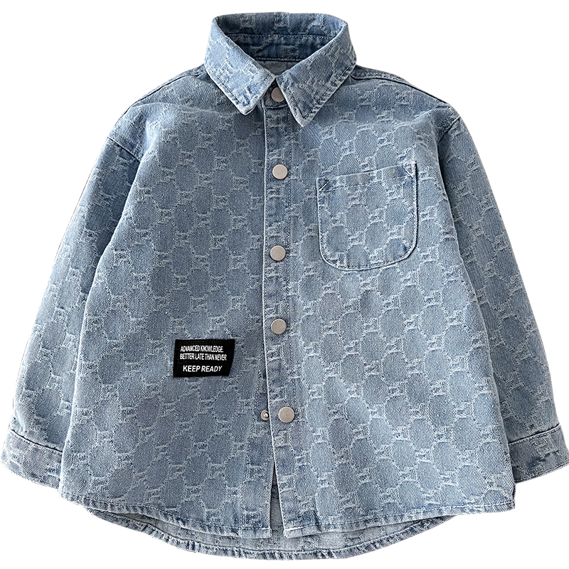 男童提花牛仔衬衫外套~中大童宽松休闲上衣纯棉翻领长袖衬衫春秋