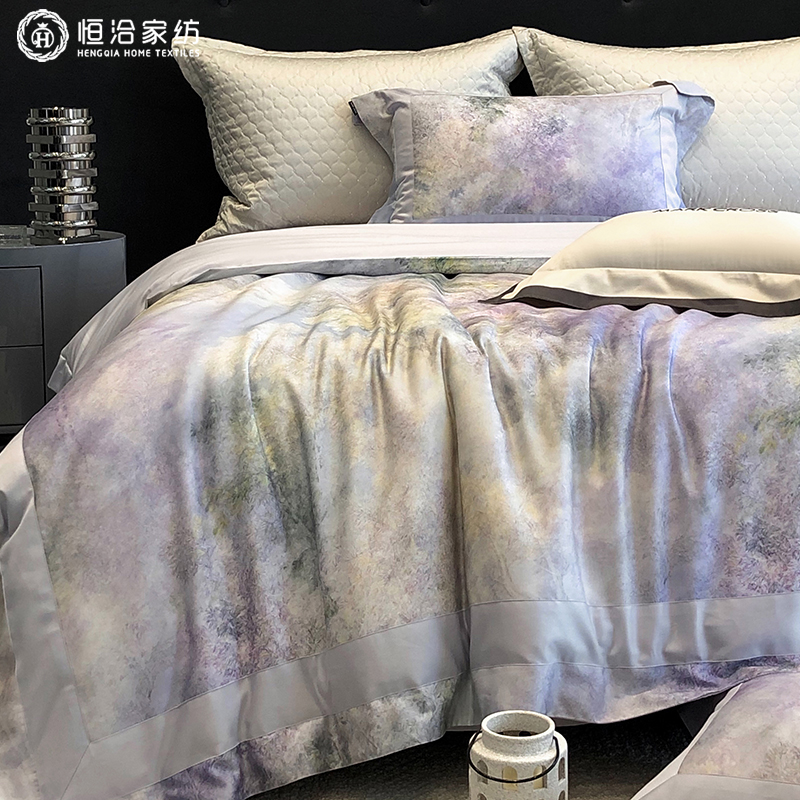 秋冬高端超细旦天丝棉磨毛四件套超柔花卉印染被套床上用品紫灰色