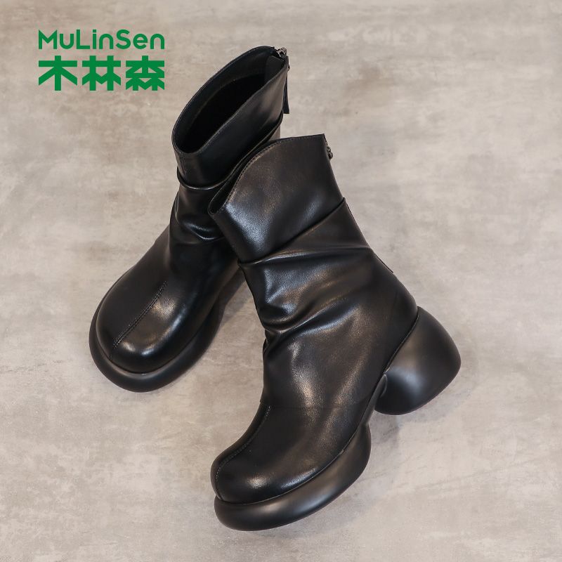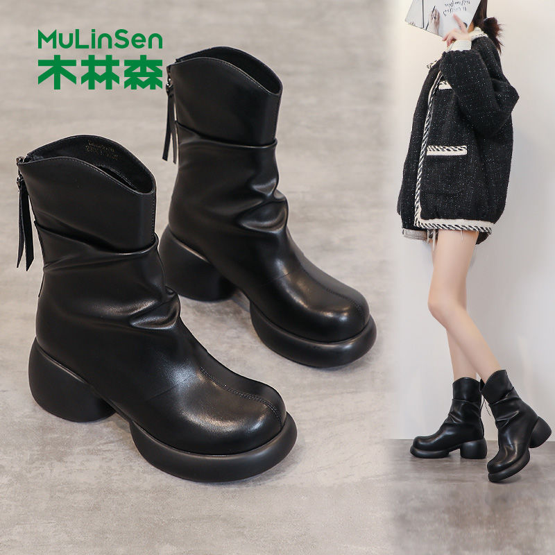 木林森女鞋冬季新款粗跟时装靴女高跟骑士靴加绒褶皱堆堆靴中筒靴
