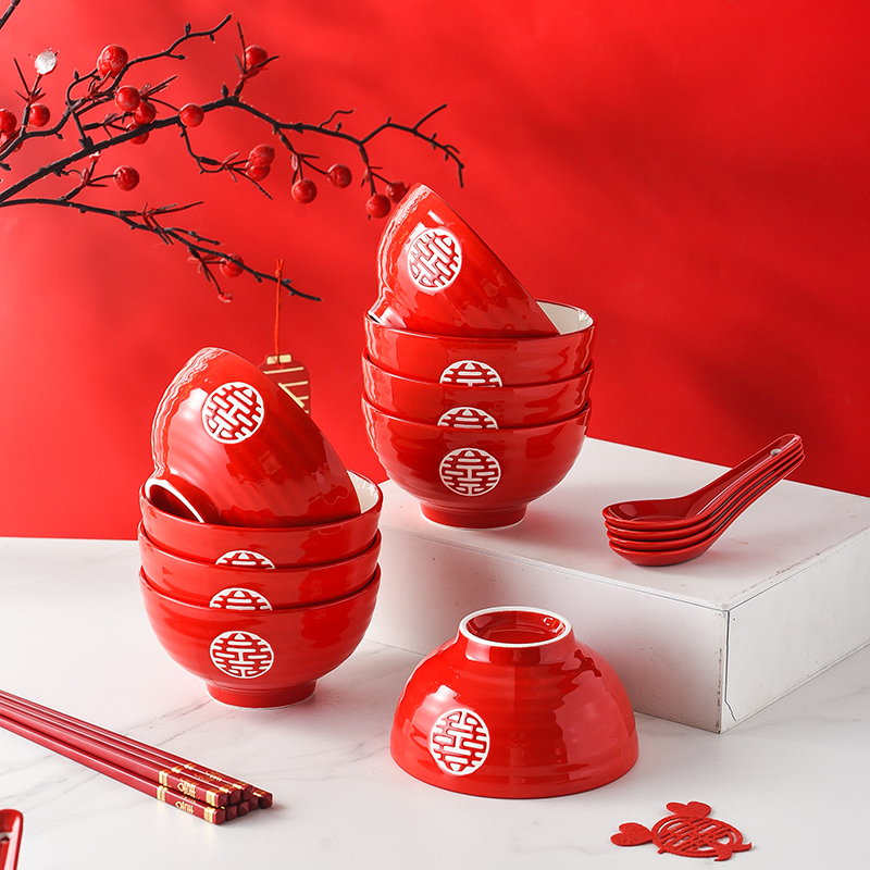 结婚新人喜碗对碗陶瓷红碗筷5英寸陪嫁套装婚庆礼物伴手礼新人礼
