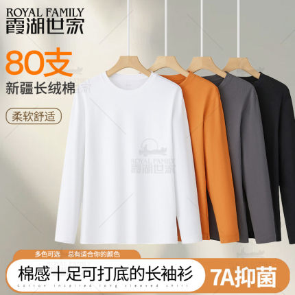 霞湖世家80支长袖t恤男女长绒棉7A抑菌纯色圆领打底衫白T三代179A
