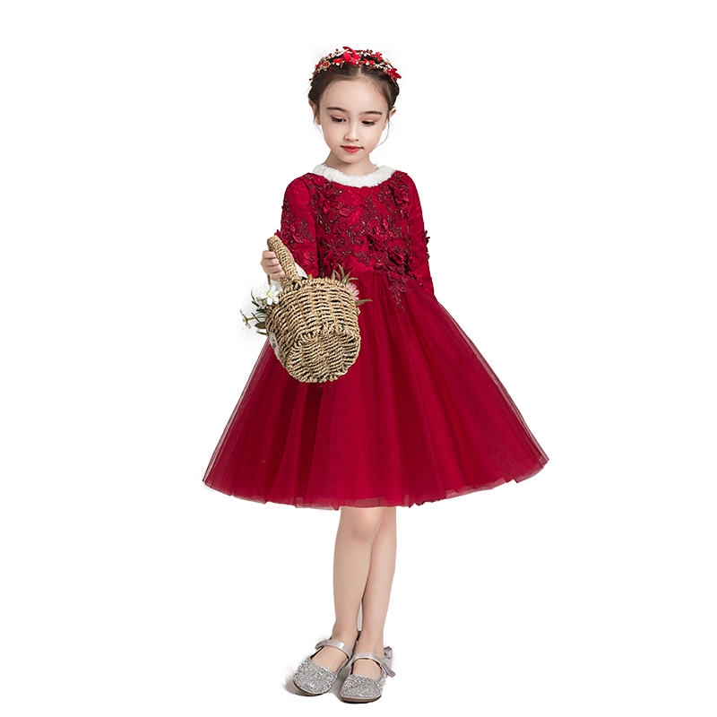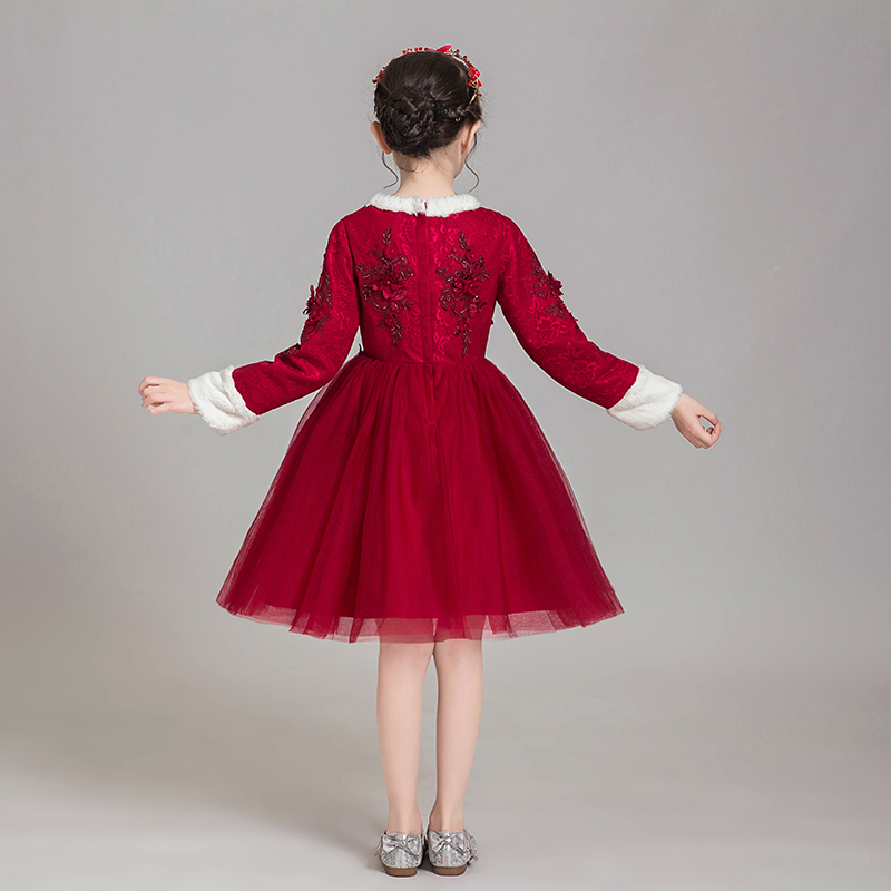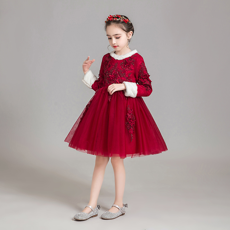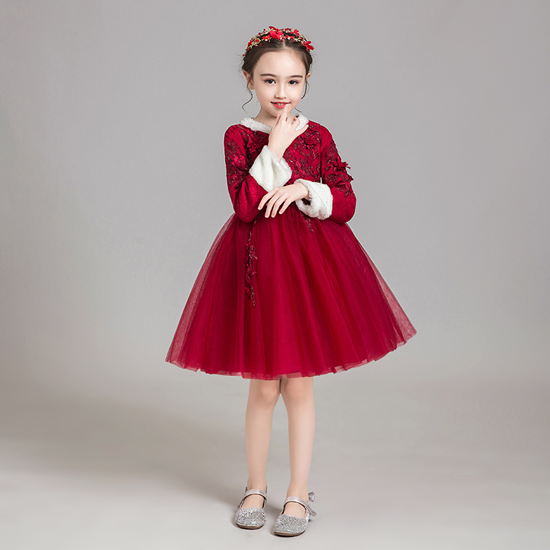 女童红色礼服公主裙长袖加厚加绒小花童主持人儿童V钢琴演出服冬