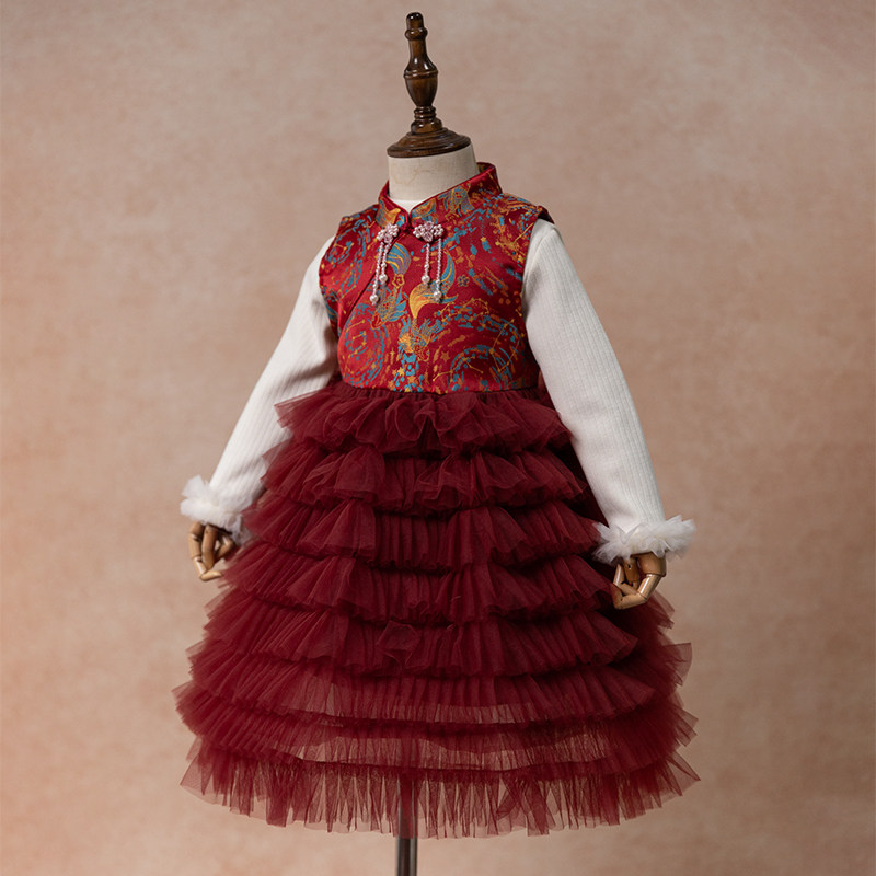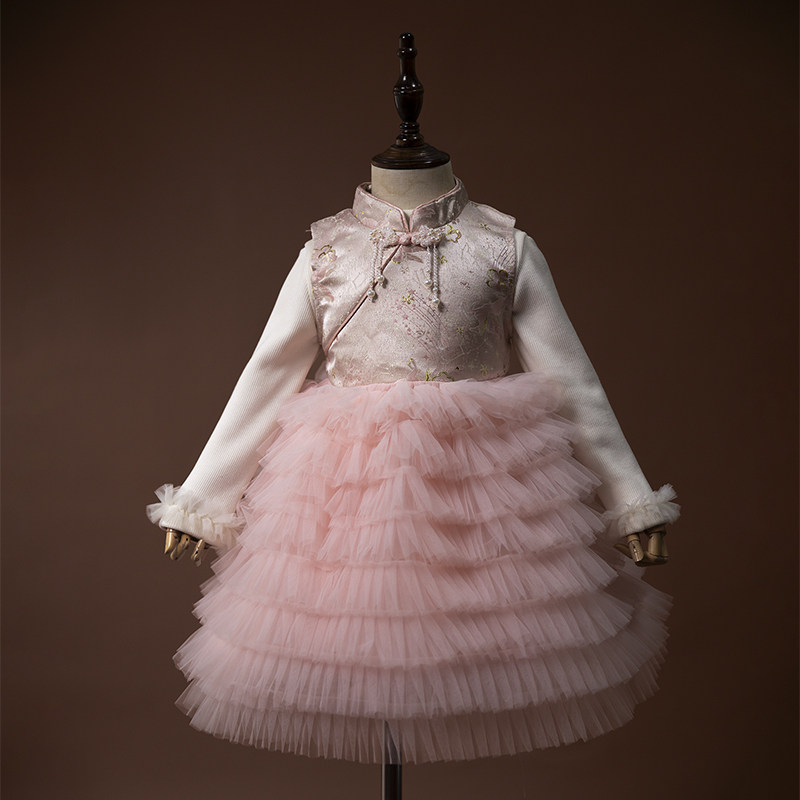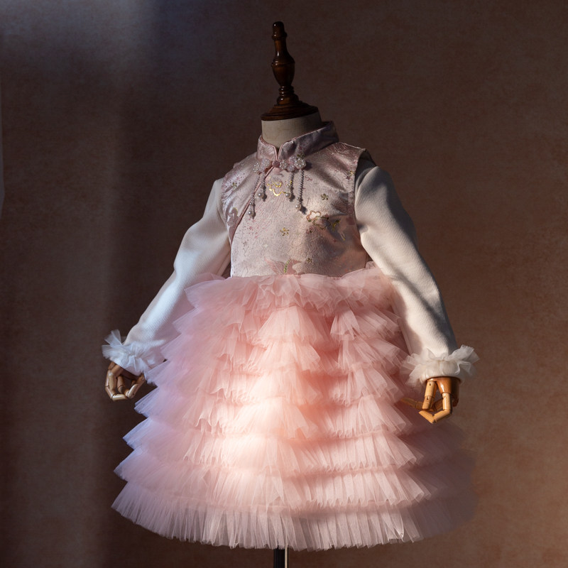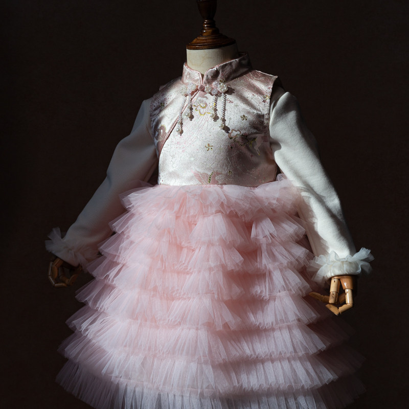 女童秋冬中国风旗袍连衣裙套装新年加绒公主裙生日礼服裙子蛋糕裙