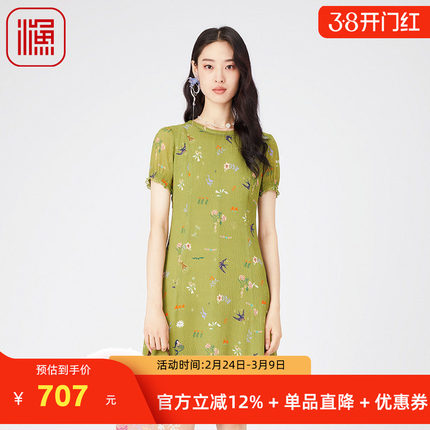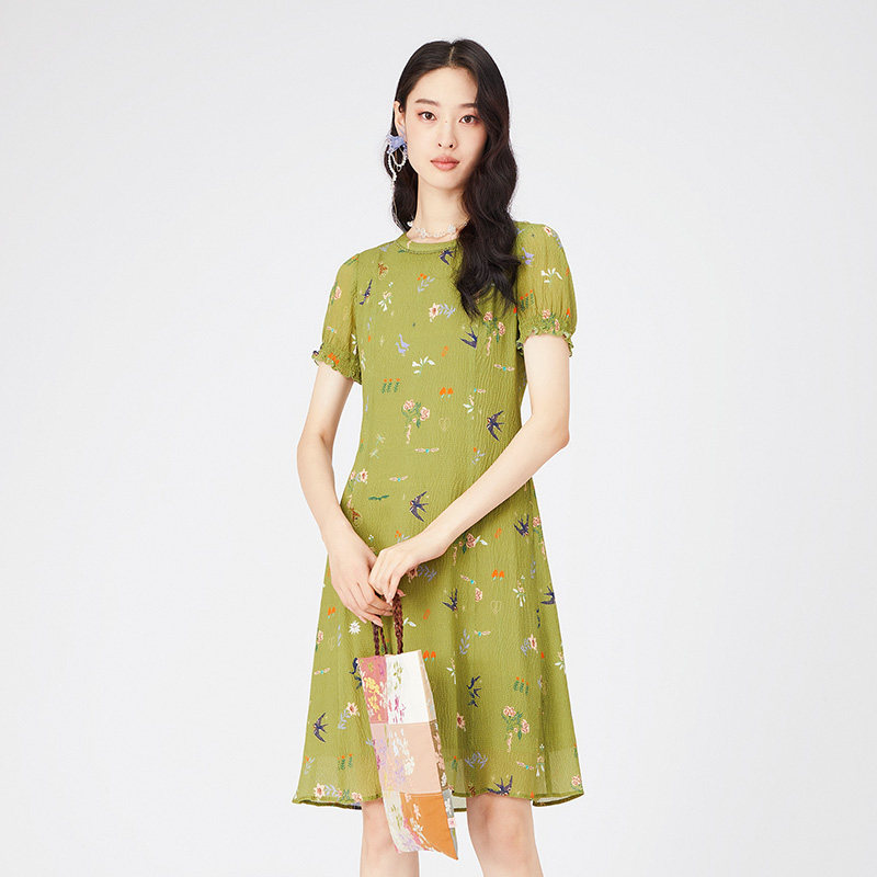 渔牌女装真丝连衣裙2024新款夏气质修身印花休闲长款裙子FGGB0085