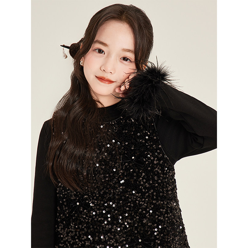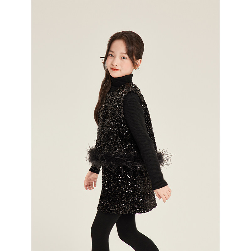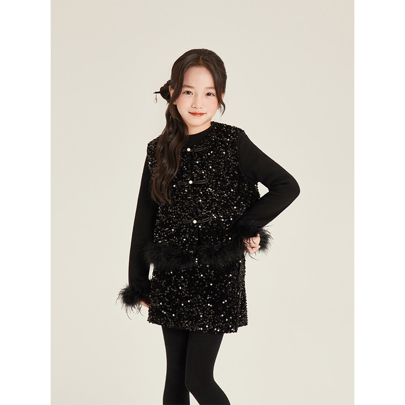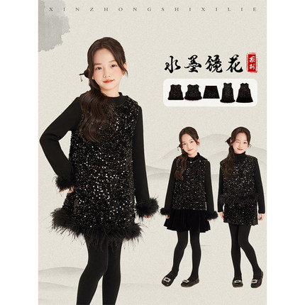 Amybaby女童套装冬季2025新款中式国风系列亮片鸵鸟毛背心裙马甲