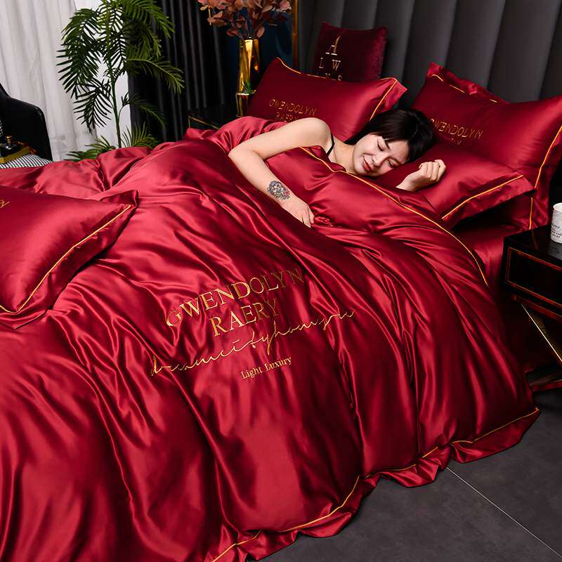 婚庆冰丝四件套酒红色夏天丝滑被套床单结婚薄款被罩床笠床上用品