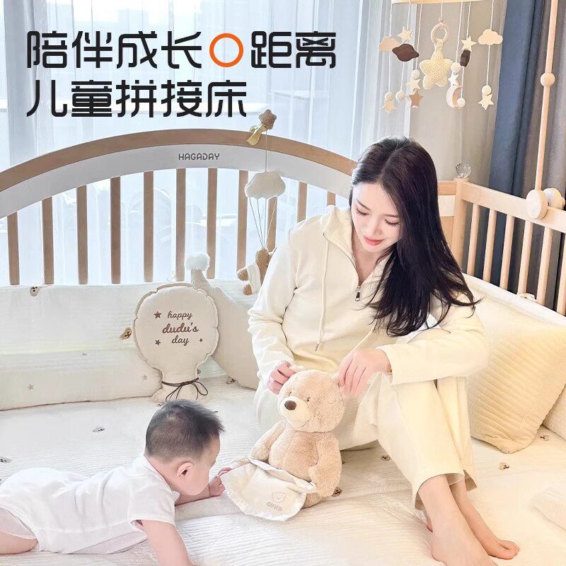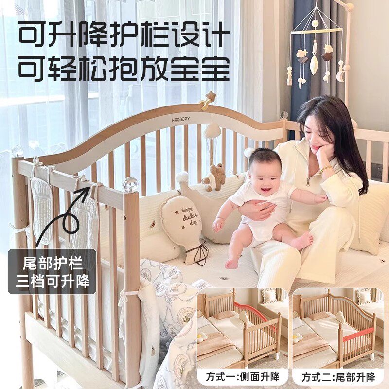 儿童拼接床高低可调婴儿实木加宽床大人可睡定制围栏可升降榉木床
