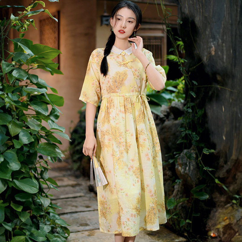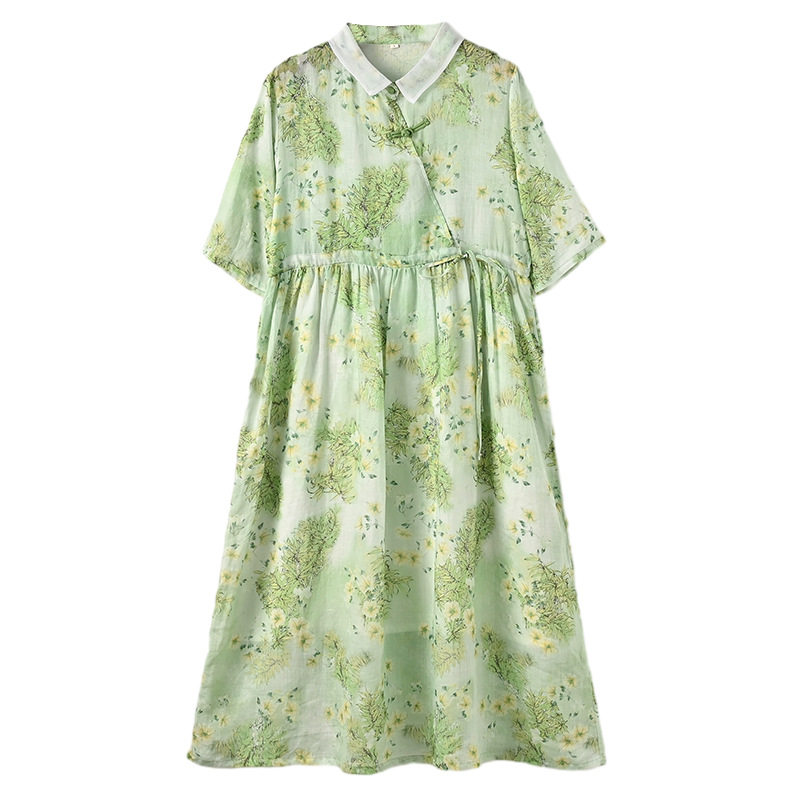 芬妮小姐高腰系带收腰连衣裙 2024年春夏新款翻领苎麻碎花中长裙