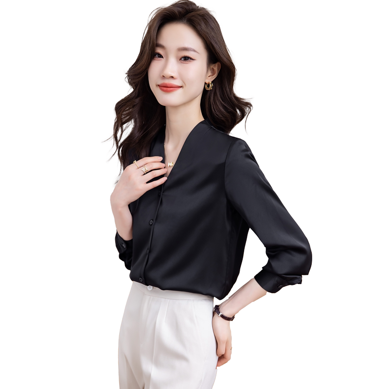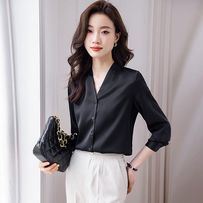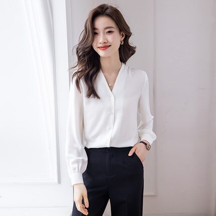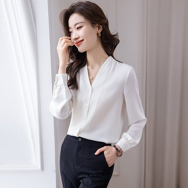 白色V领衬衫女春秋新款高端气质长袖雪纺衬衣正装工作服职业套装