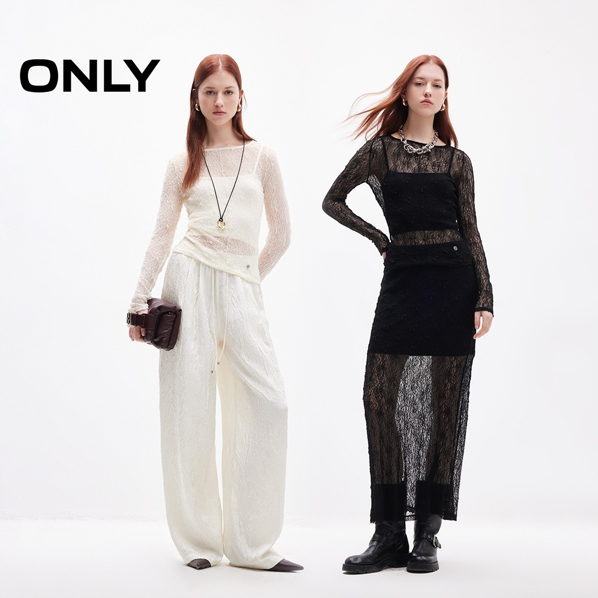 ONLY奥莱2025秋冬新款辣妹性感蕾丝修身长袖吊带套装T恤女