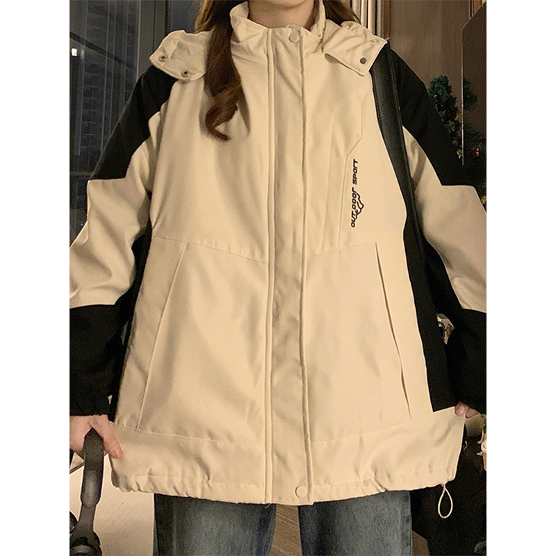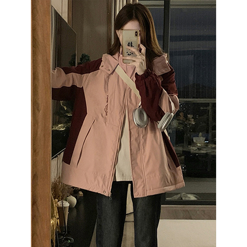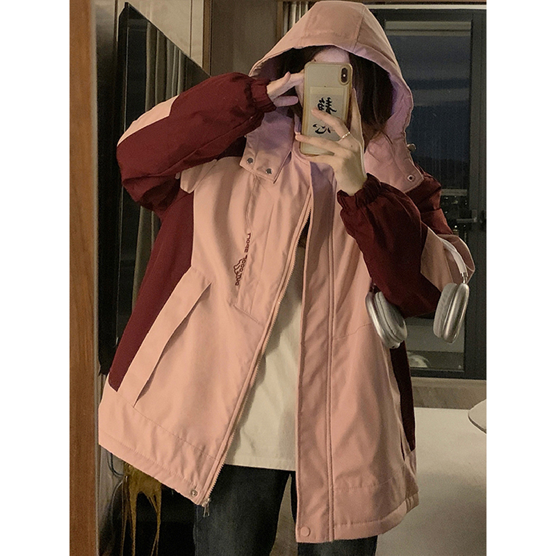 特大码女装撞色夹棉冲锋衣秋冬新款胖mm百搭保暖棉服粉色连帽外套
