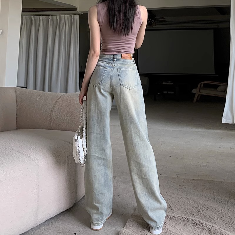 美式复古高街黄泥窄版阔腿牛仔裤女浅色宽松直筒高腰显瘦垂感拖地