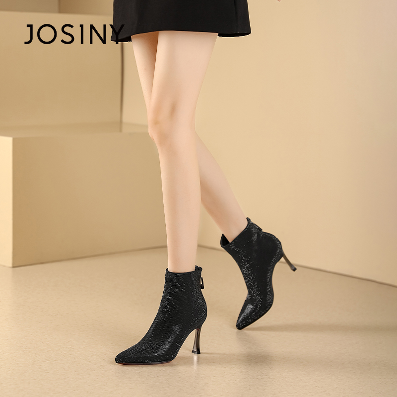 卓诗尼冬季女靴撤柜正品短筒靴璀璨满钻尖头靴性感时尚百搭高跟鞋