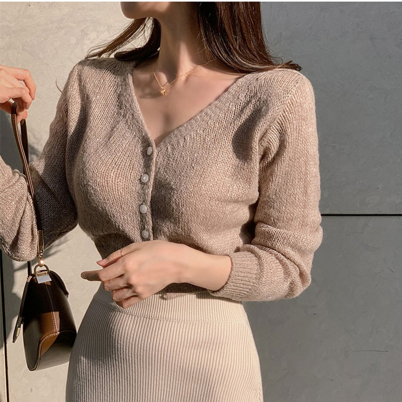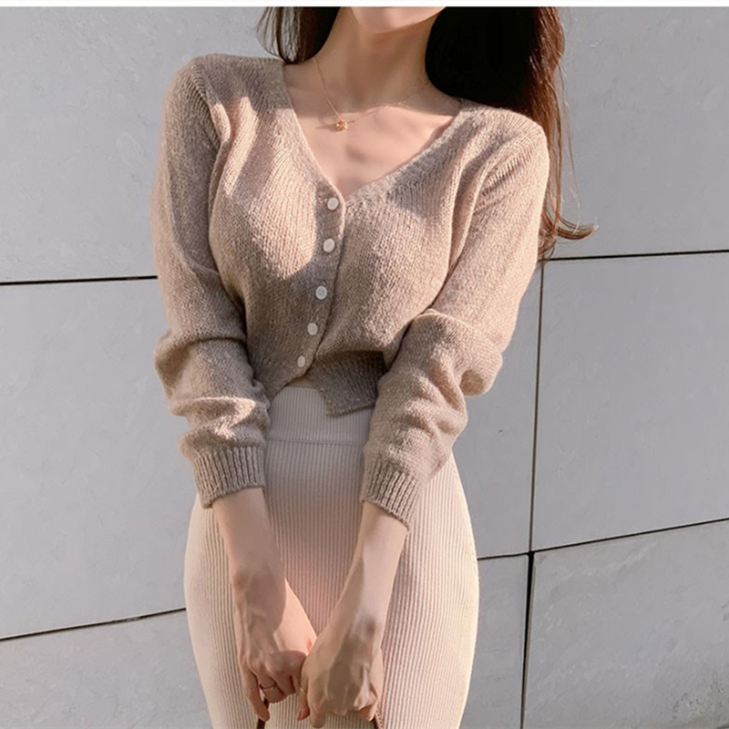 韩国东大门新款气质温柔V领系扣短款修身百搭长袖针织开衫T恤女