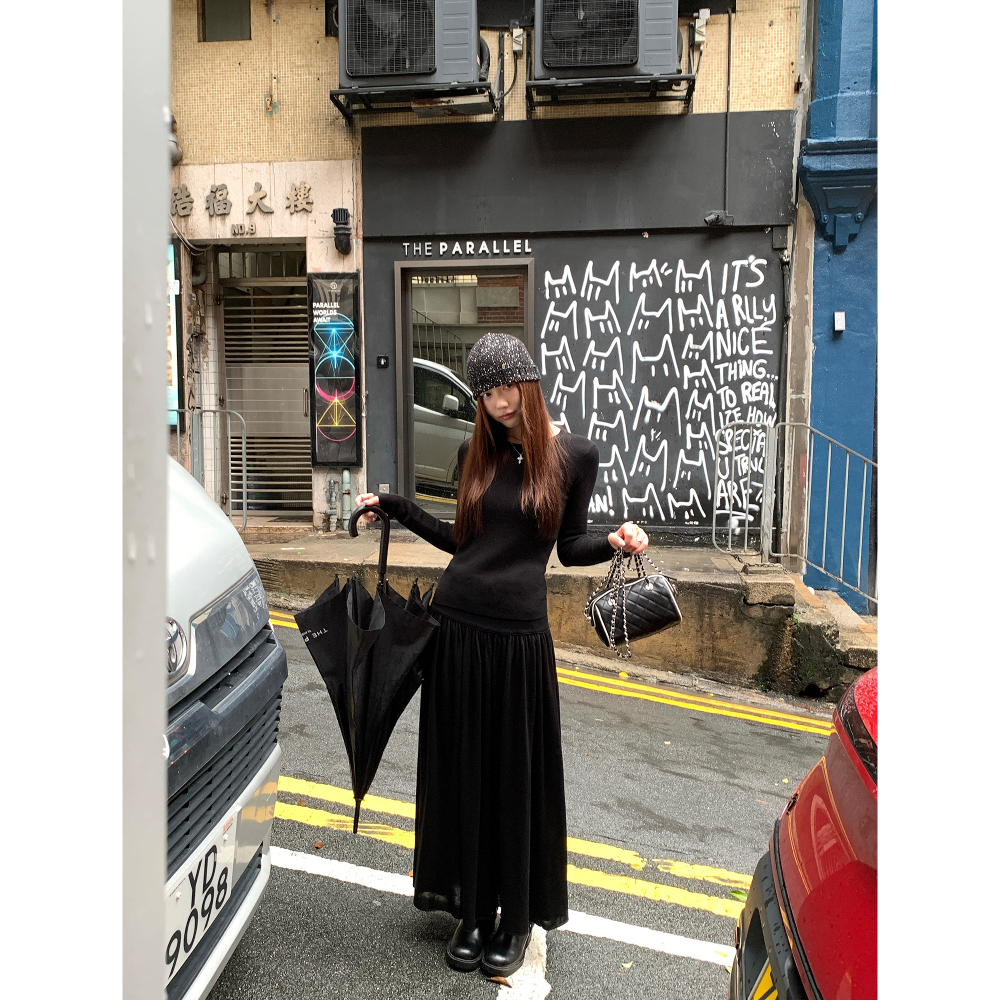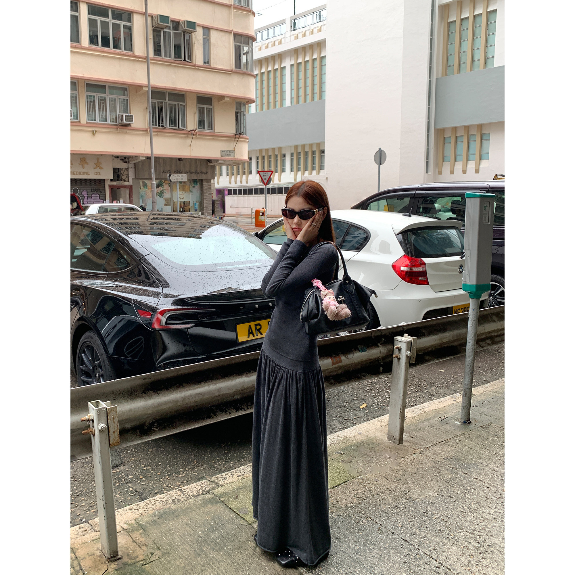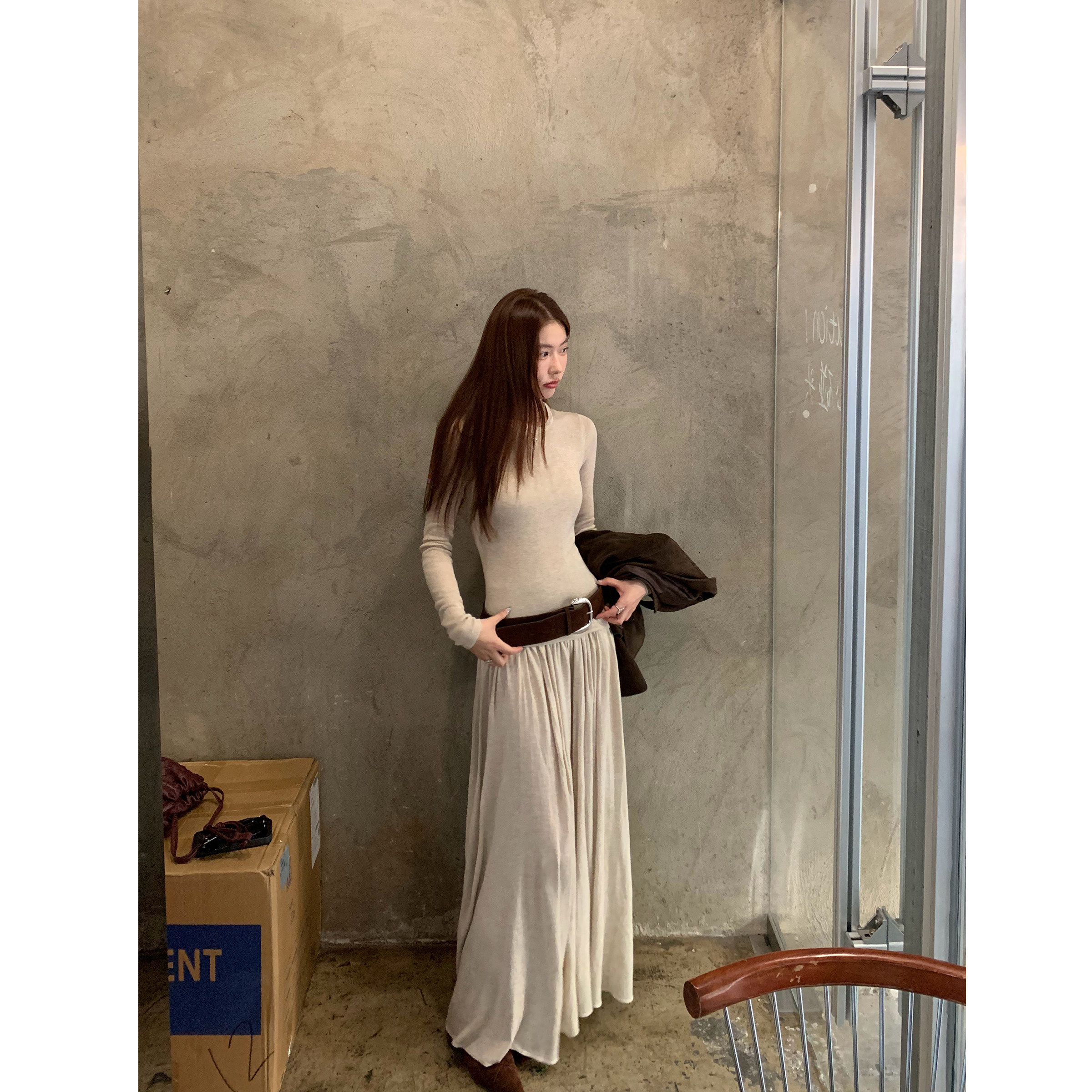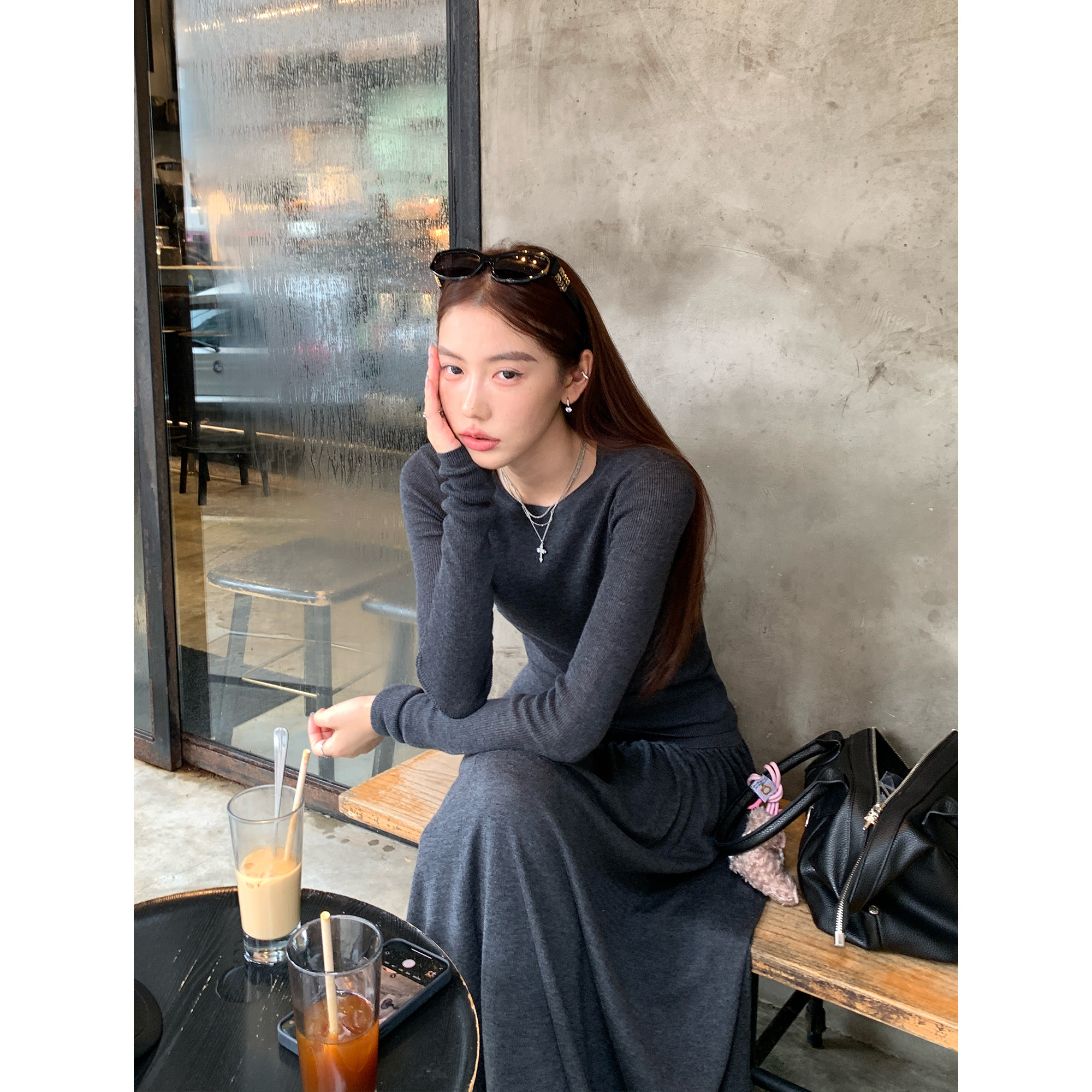 pusumede 慵懒假期 圆领长袖针织衫修身上衣女+长款半身裙套装